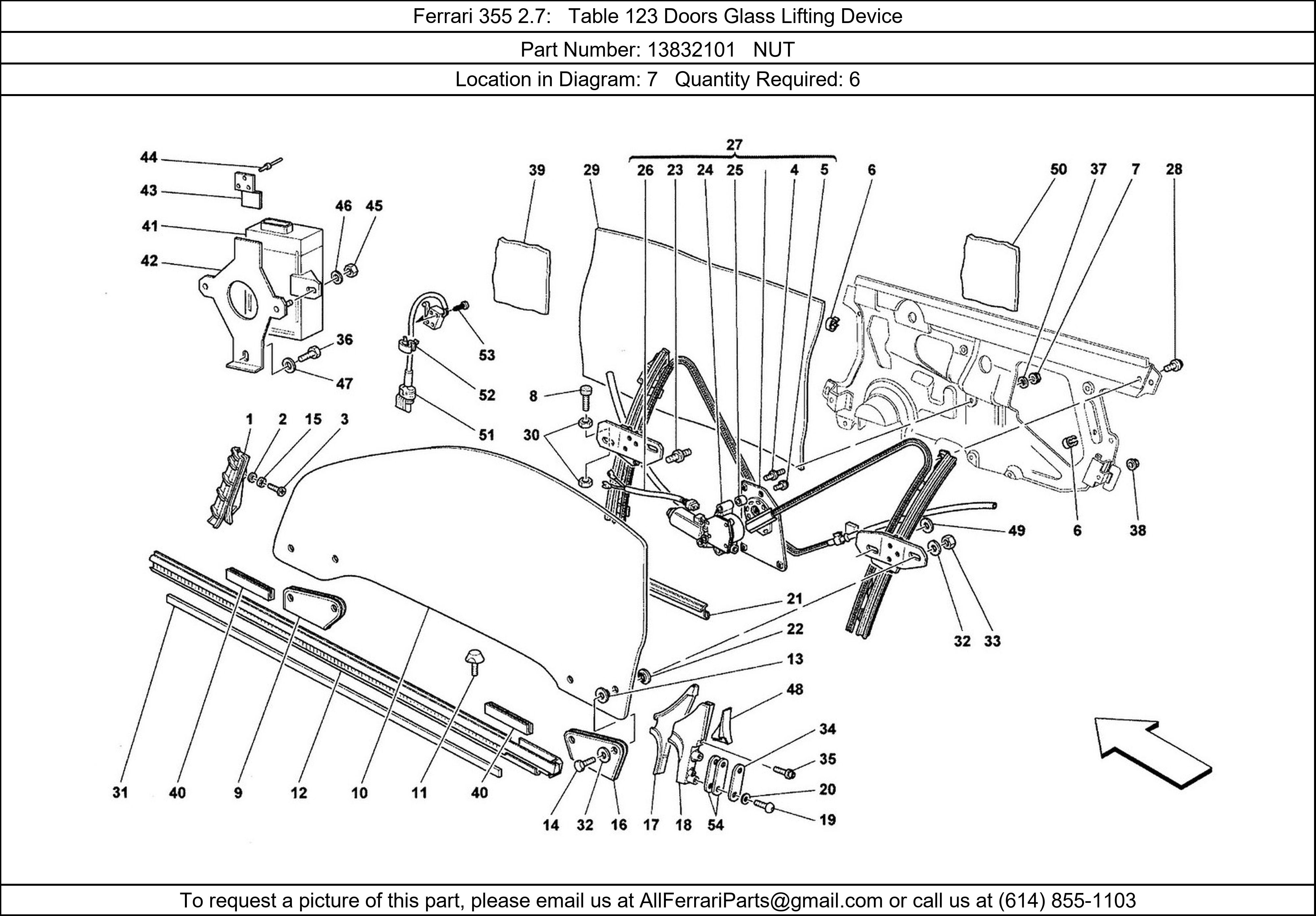 Ferrari Part 13832101, NUT, shown here as used in Ferrari 355 2.7 Table 123 Doors Glass Lifting Device. Other uses of this part are shown below: