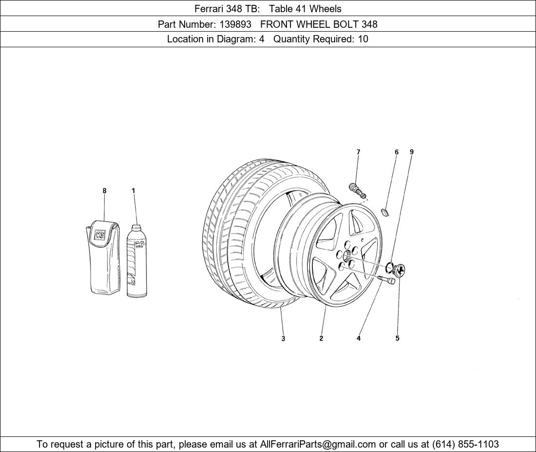 Ferrari Part 139893, FRONT WHEEL BOLT 348, shown here as used in Ferrari 348 TB Table 41 Wheels. Other uses of this part are shown below:
