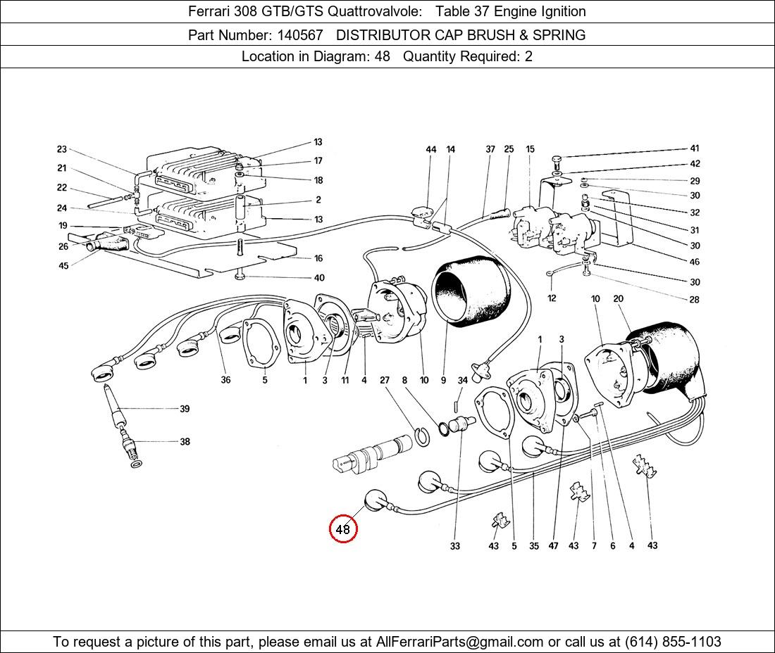 Ferrari Part Number 140567, DISTRIBUTOR CAP BRUSH & SPRING shown here as used in Ferrari 308 GTB/GTS Quattrovalvole Table 37 Engine Ignition. Location in Diagram: 48. Required Quantity: 2. This Ferrari part is used in more than one diagram. Click on the diagrams below to see alternative uses of this part: