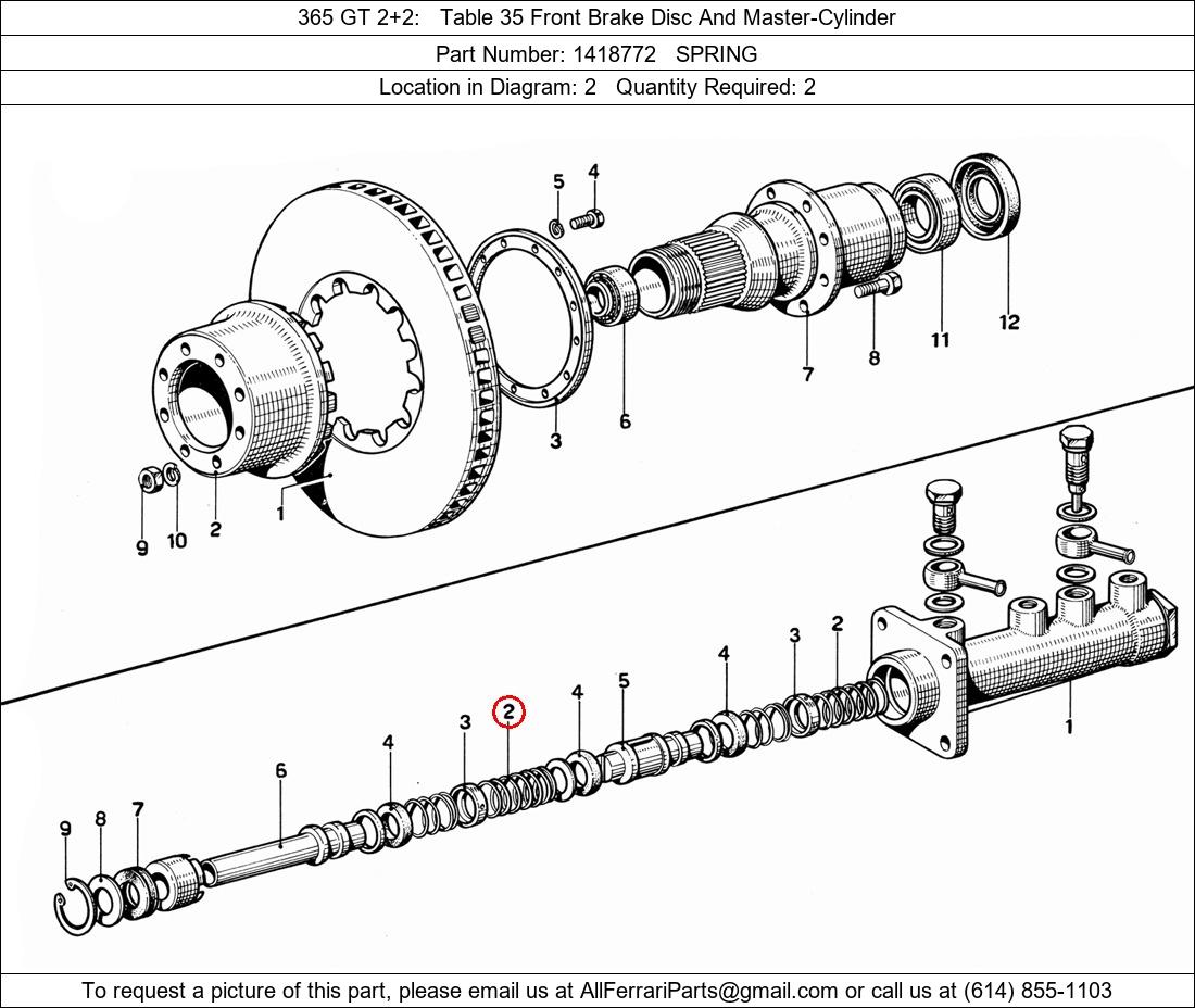 Ferrari Part Number 1418772, SPRING shown here as used in 365 GT 2+2 Table 35 Front Brake Disc And Master-Cylinder. Location in Diagram: 2. Required Quantity: 2