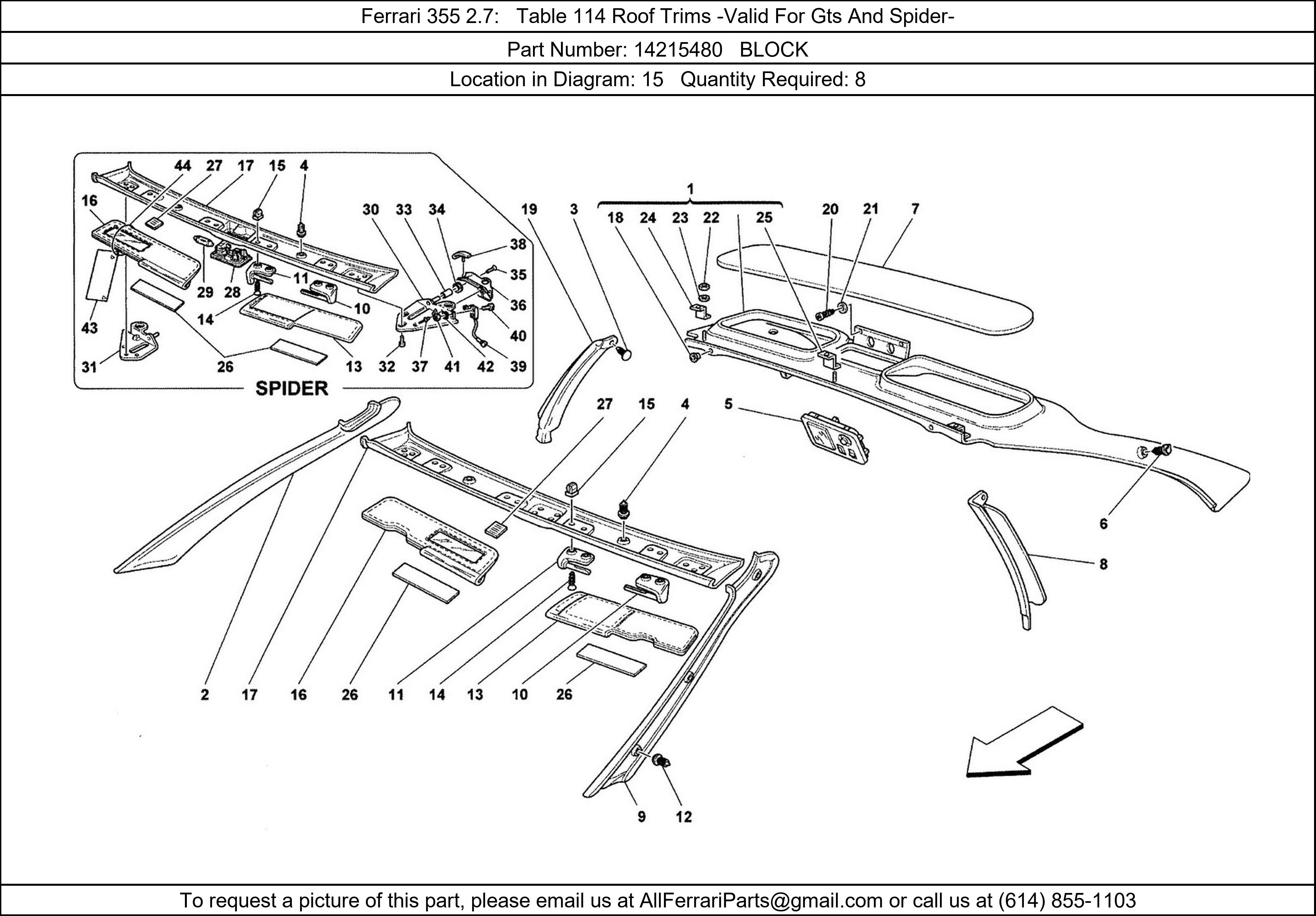 Ferrari Part 14215480, BLOCK, shown here as used in Ferrari 355 2.7 Table 114 Roof Trims -Valid For Gts And Spider-. Other uses of this part are shown below: