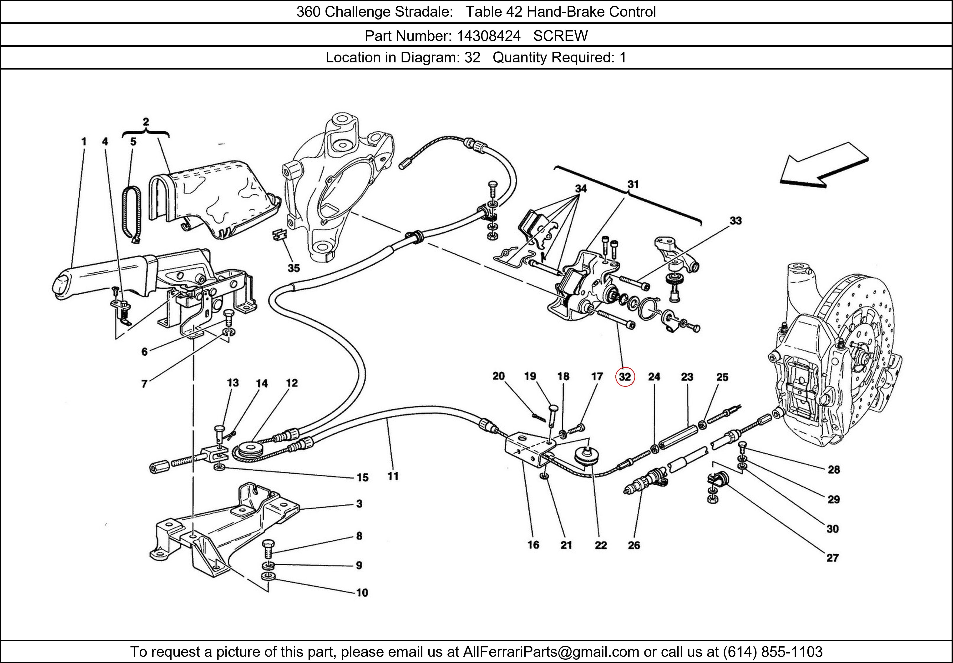 Ferrari Part Number 14308424, SCREW shown here as used in 360 Challenge Stradale Table 42 Hand-Brake Control. Location in Diagram: 32. Required Quantity: 1. This Ferrari part is used in more than one diagram. Click on the diagrams below to see alternative uses of this part:
