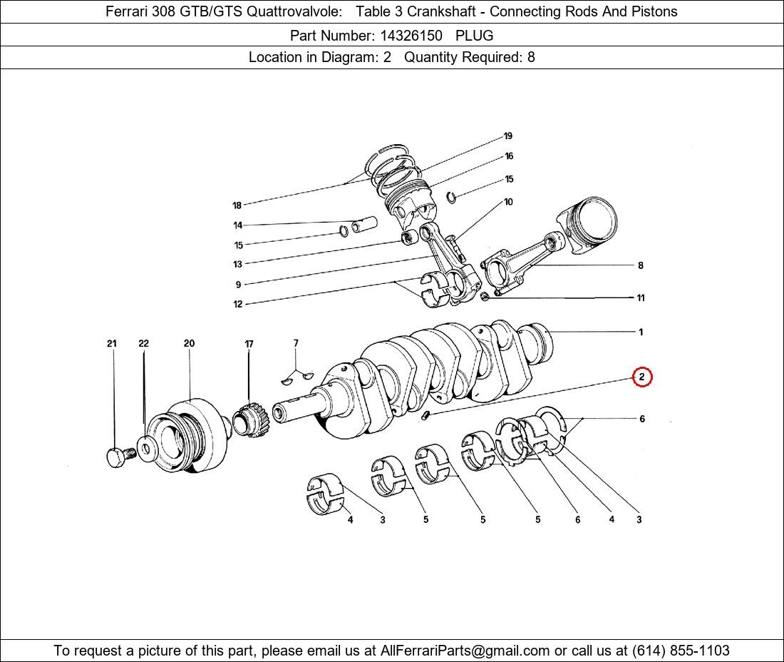 Ferrari Part Number 14326150, PLUG shown here as used in Ferrari 308 GTB/GTS Quattrovalvole Table 3 Crankshaft - Connecting Rods And Pistons. Location in Diagram: 2. Required Quantity: 8. This Ferrari part is used in more than one diagram. Click on the diagrams below to see alternative uses of this part: