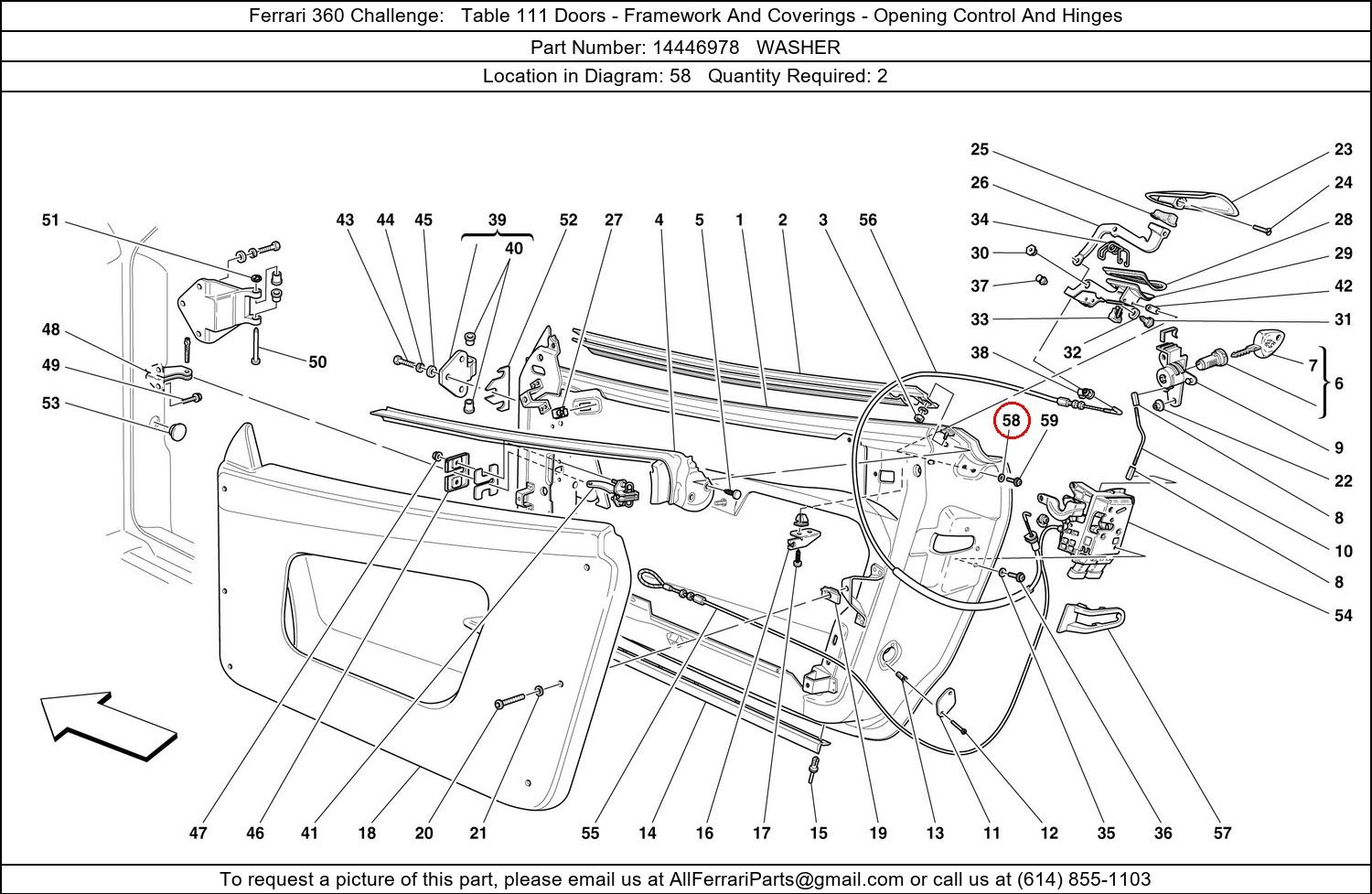 Ferrari Part Number 14446978, WASHER shown here as used in Ferrari 360 Challenge Table 111 Doors - Framework And Coverings - Opening Control And Hinges. Location in Diagram: 58. Required Quantity: 2