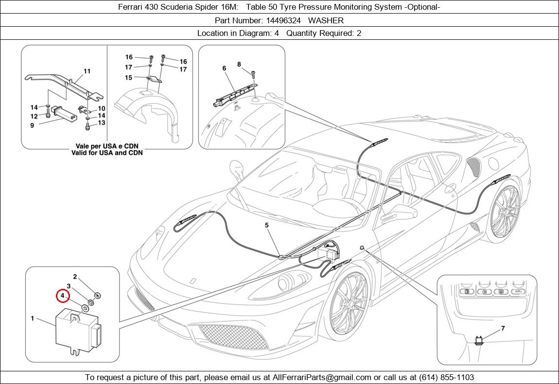 Ferrari Part Number 14496324, WASHER shown here as used in Ferrari 430 Scuderia Spider 16M Table 50 Tyre Pressure Monitoring System -Optional-. Location in Diagram: 4. Required Quantity: 2. This Ferrari part is used in more than one diagram. Click on the diagrams below to see alternative uses of this part: