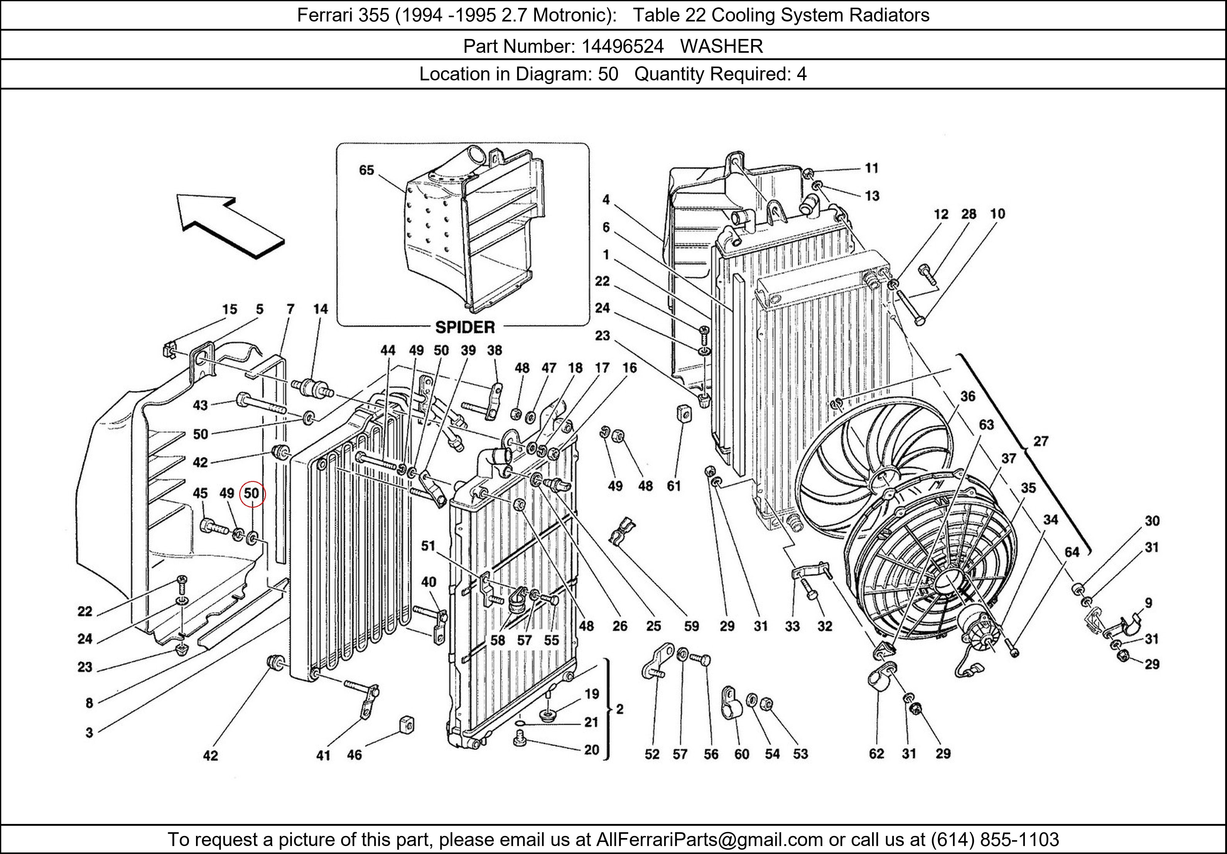 Ferrari Part Number 14496524, WASHER shown here as used in Ferrari 355 (1994 -1995 2.7 Motronic) Table 22 Cooling System Radiators. Location in Diagram: 50. Required Quantity: 4. This Ferrari part is used in more than one diagram. Click on the diagrams below to see alternative uses of this part: