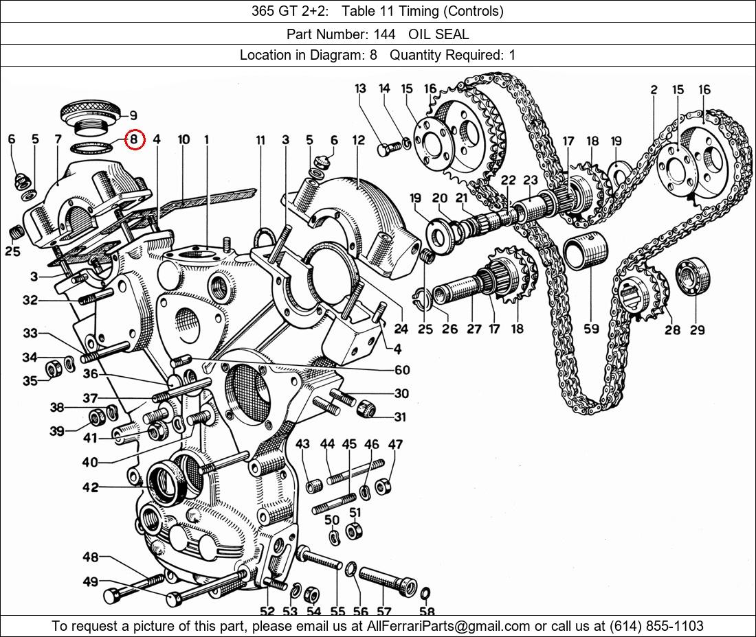 Ferrari Part Number 144, OIL SEAL shown here as used in 365 GT 2+2 Table 11 Timing (Controls). Location in Diagram: 8. Required Quantity: 1