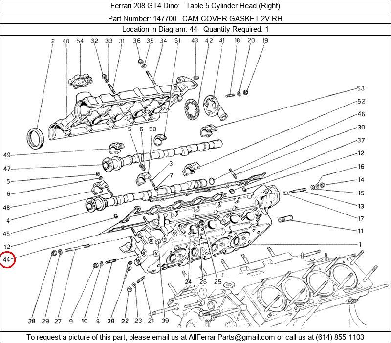 Ferrari Part Number 147700, CAM COVER GASKET 2V RH shown here as used in Ferrari 208 GT4 Dino Table 5 Cylinder Head (Right). Location in Diagram: 44. Required Quantity: 1. This Ferrari part is used in more than one diagram. Click on the diagrams below to see alternative uses of this part: