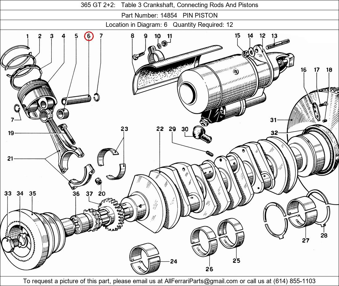 Ferrari Part Number 14854, PIN PISTON shown here as used in 365 GT 2+2 Table 3 Crankshaft, Connecting Rods And Pistons. Location in Diagram: 6. Required Quantity: 12. This Ferrari part is used in more than one diagram. Click on the diagrams below to see alternative uses of this part: