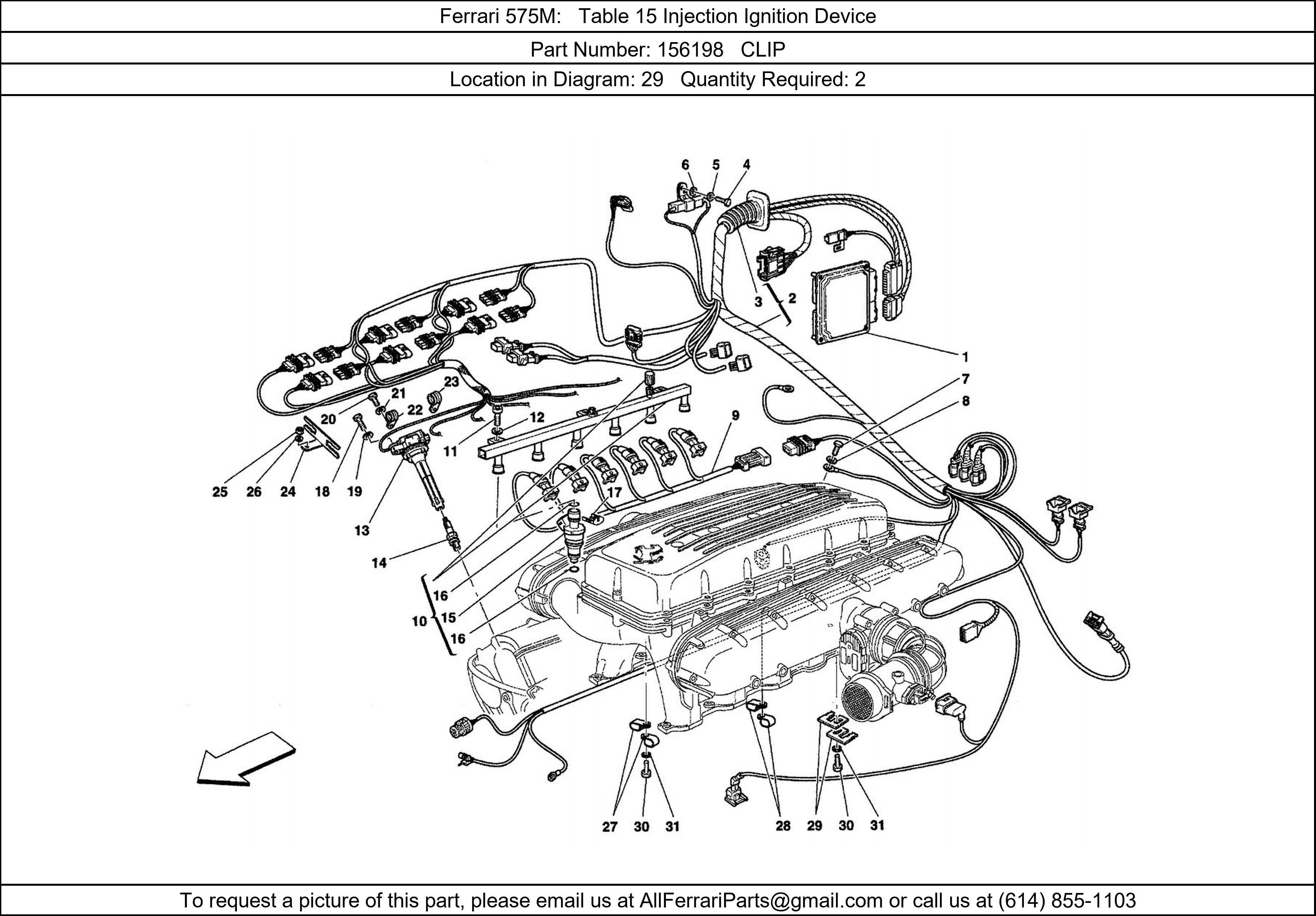 Ferrari Part 156198, CLIP, shown here as used in Ferrari 575M Table 15 Injection Ignition Device. Other uses of this part are shown below: