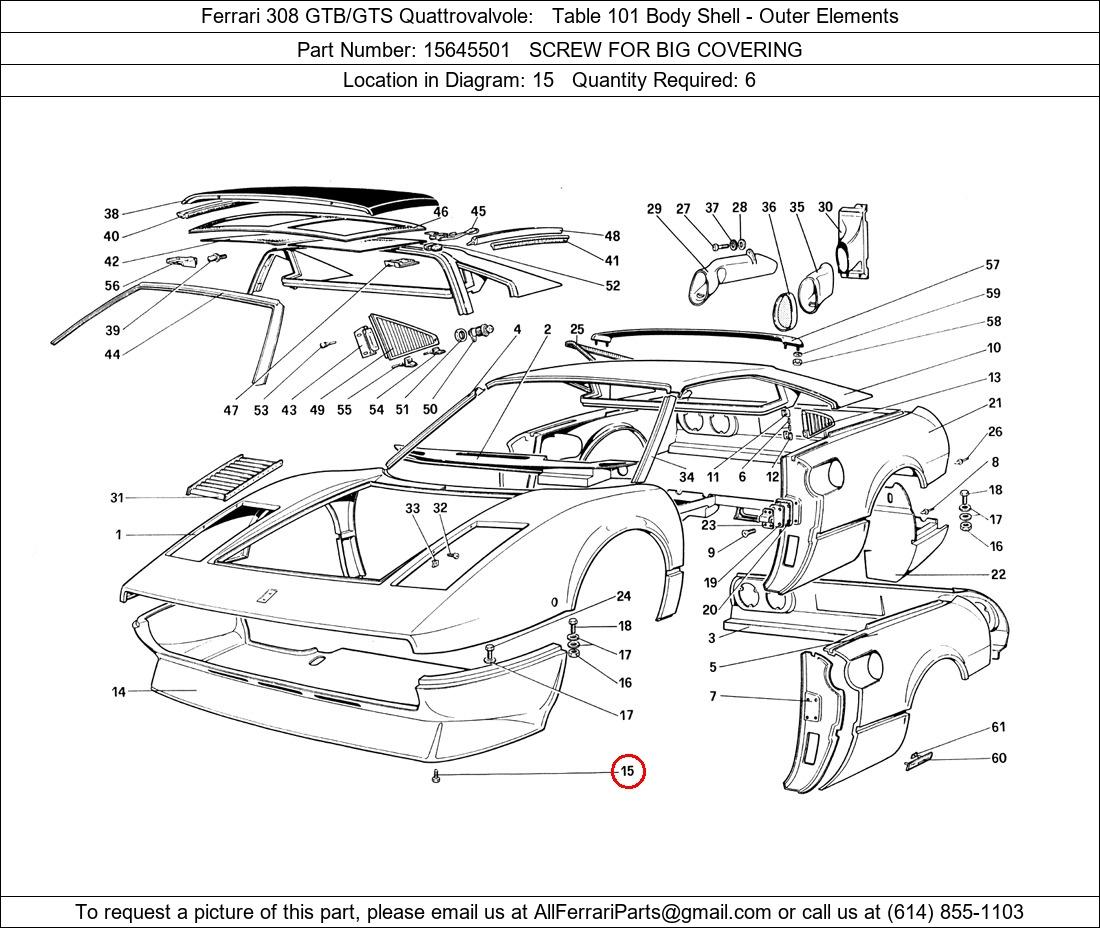Ferrari Part Number 15645501, SCREW FOR BIG COVERING shown here as used in Ferrari 308 GTB/GTS Quattrovalvole Table 101 Body Shell - Outer Elements. Location in Diagram: 15. Required Quantity: 6. This Ferrari part is used in more than one diagram. Click on the diagrams below to see alternative uses of this part: