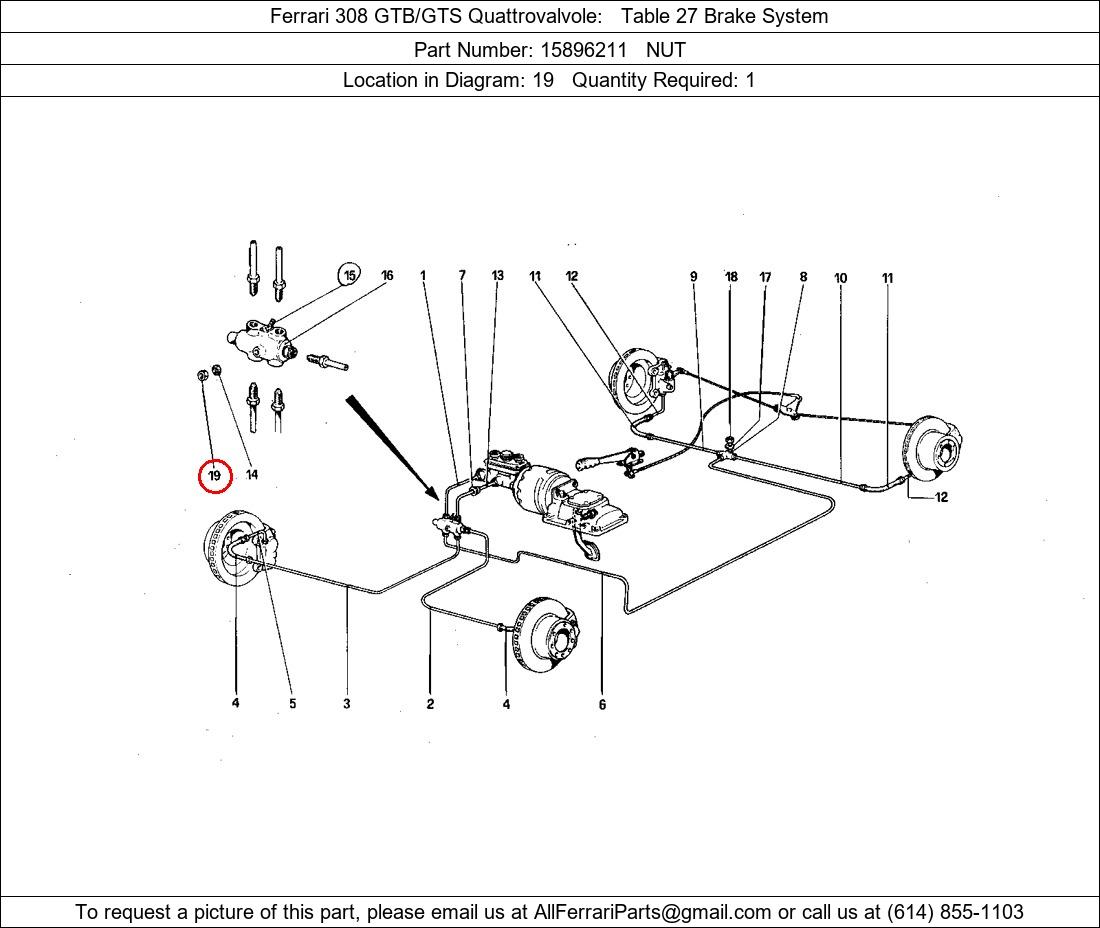 Ferrari Part Number 15896211, NUT shown here as used in Ferrari 308 GTB/GTS Quattrovalvole Table 27 Brake System. Location in Diagram: 19. Required Quantity: 1. This Ferrari part is used in more than one diagram. Click on the diagrams below to see alternative uses of this part: