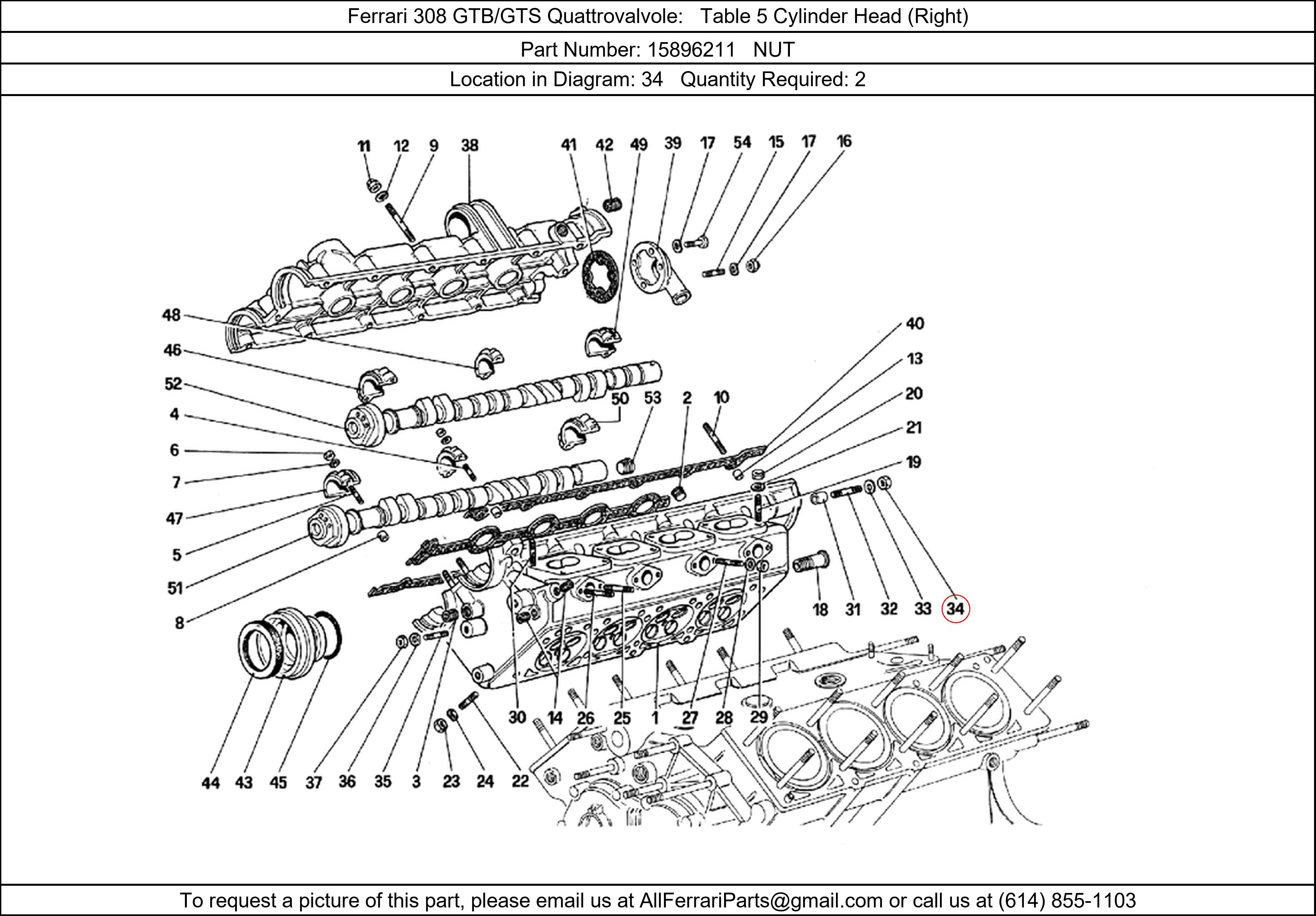 Ferrari Part Number 15896211, NUT shown here as used in Ferrari 308 GTB/GTS Quattrovalvole Table 5 Cylinder Head (Right). Location in Diagram: 34. Required Quantity: 2. This Ferrari part is used in more than one diagram. Click on the diagrams below to see alternative uses of this part: