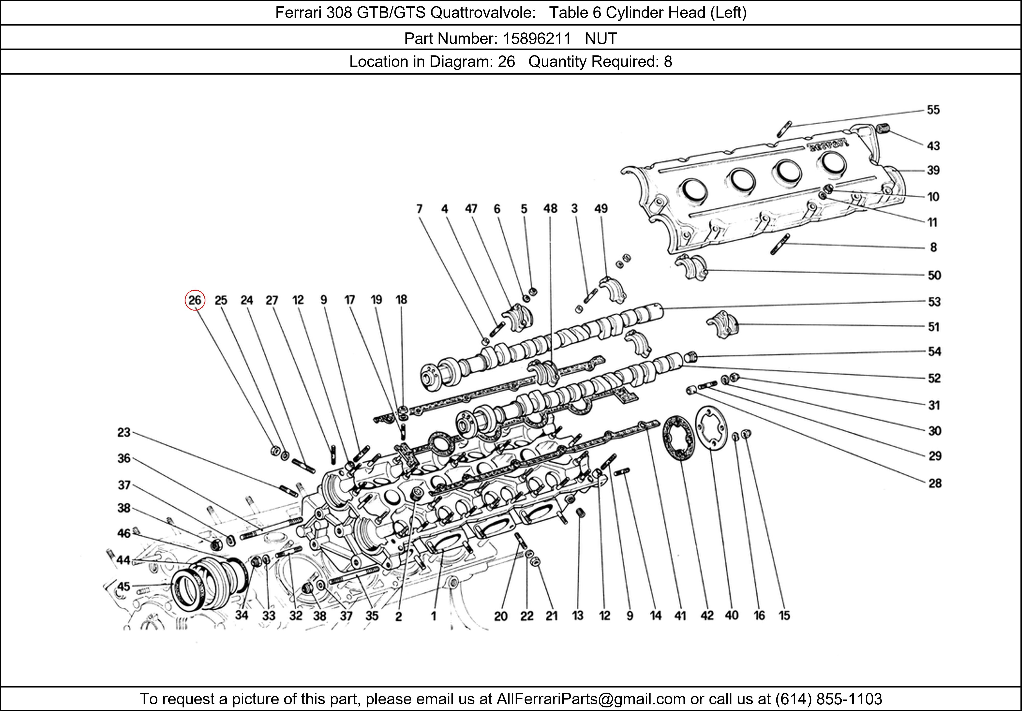 Ferrari Part Number 15896211, NUT shown here as used in Ferrari 308 GTB/GTS Quattrovalvole Table 6 Cylinder Head (Left). Location in Diagram: 26. Required Quantity: 8. This Ferrari part is used in more than one diagram. Click on the diagrams below to see alternative uses of this part:
