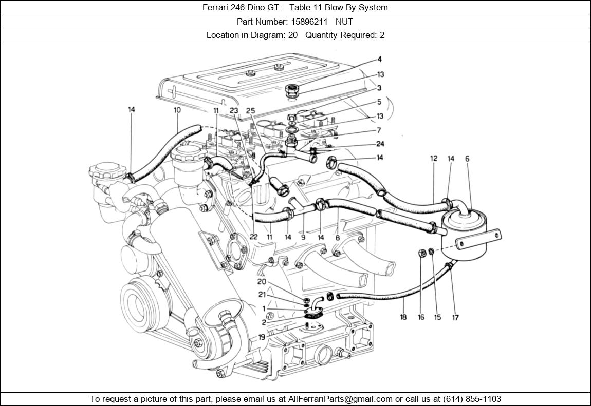 Ferrari Part 15896211, NUT, shown here as used in Ferrari 246 Dino GT Table 11 Blow By System. Other uses of this part are shown below: