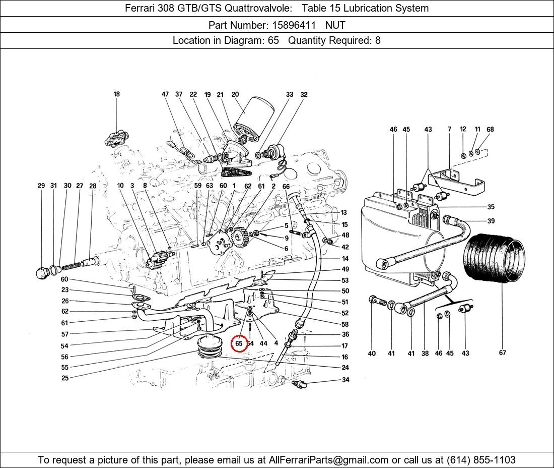 Ferrari Part Number 15896411, NUT shown here as used in Ferrari 308 GTB/GTS Quattrovalvole Table 15 Lubrication System. Location in Diagram: 65. Required Quantity: 8. This Ferrari part is used in more than one diagram. Click on the diagrams below to see alternative uses of this part: