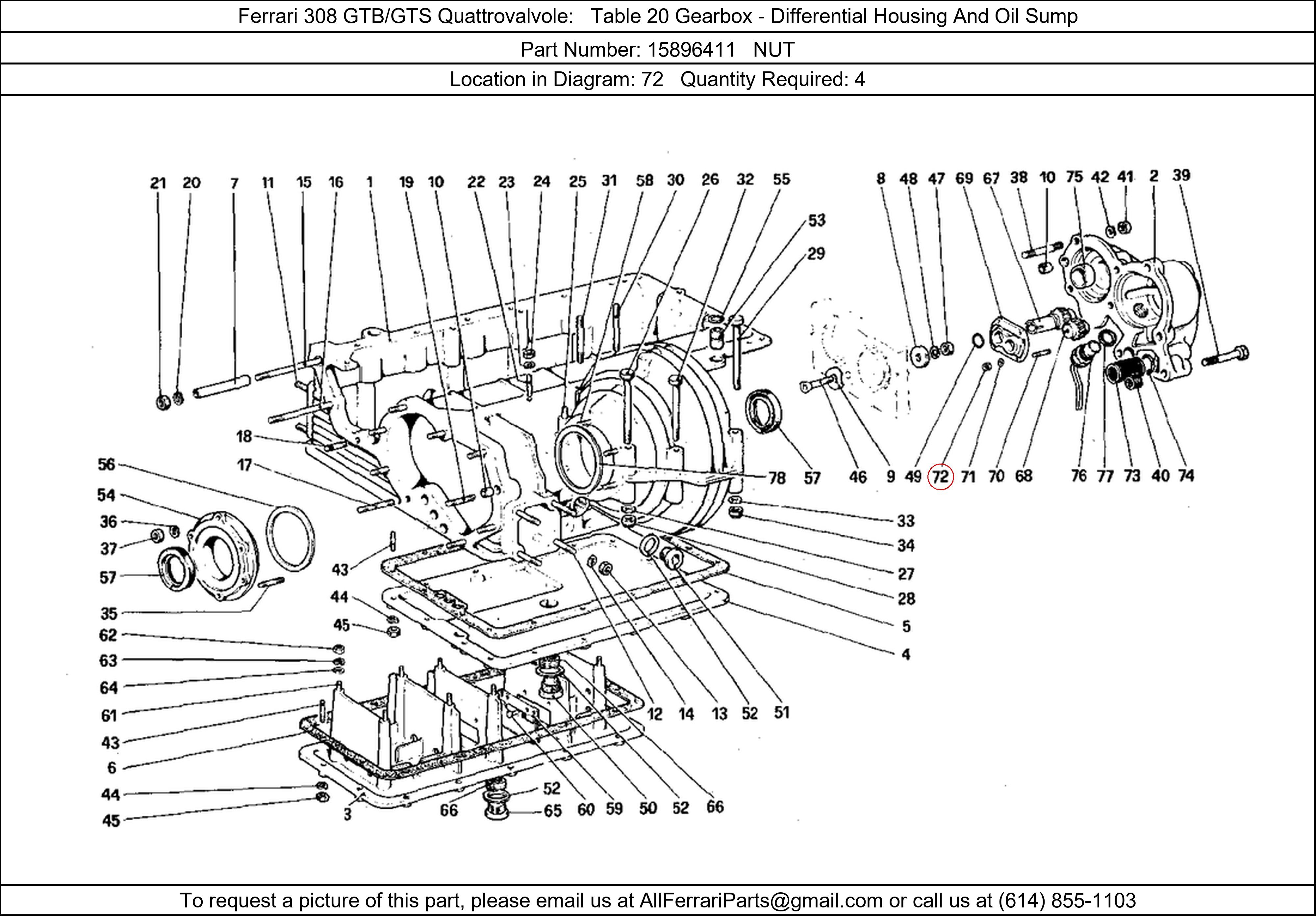 Ferrari Part Number 15896411, NUT shown here as used in Ferrari 308 GTB/GTS Quattrovalvole Table 20 Gearbox - Differential Housing And Oil Sump. Location in Diagram: 72. Required Quantity: 4. This Ferrari part is used in more than one diagram. Click on the diagrams below to see alternative uses of this part: