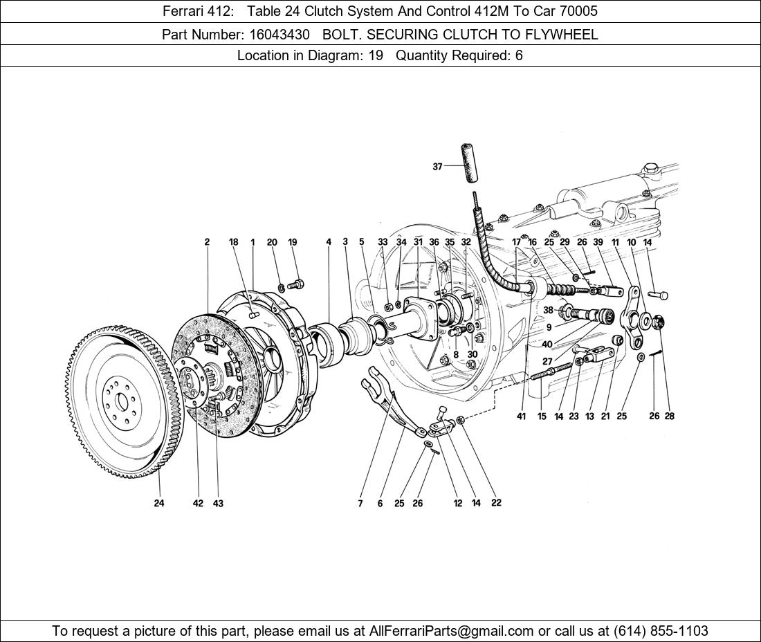 Ferrari Part 16043430, BOLT. SECURING CLUTCH TO FLYWHEEL, shown here as used in Ferrari 412 Table 24 Clutch System And Control 412M To Car 70005. Other uses of this part are shown below: