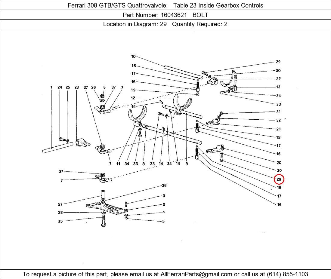 Ferrari Part Number 16043621, BOLT shown here as used in Ferrari 308 GTB/GTS Quattrovalvole Table 23 Inside Gearbox Controls. Location in Diagram: 29. Required Quantity: 2. This Ferrari part is used in more than one diagram. Click on the diagrams below to see alternative uses of this part: