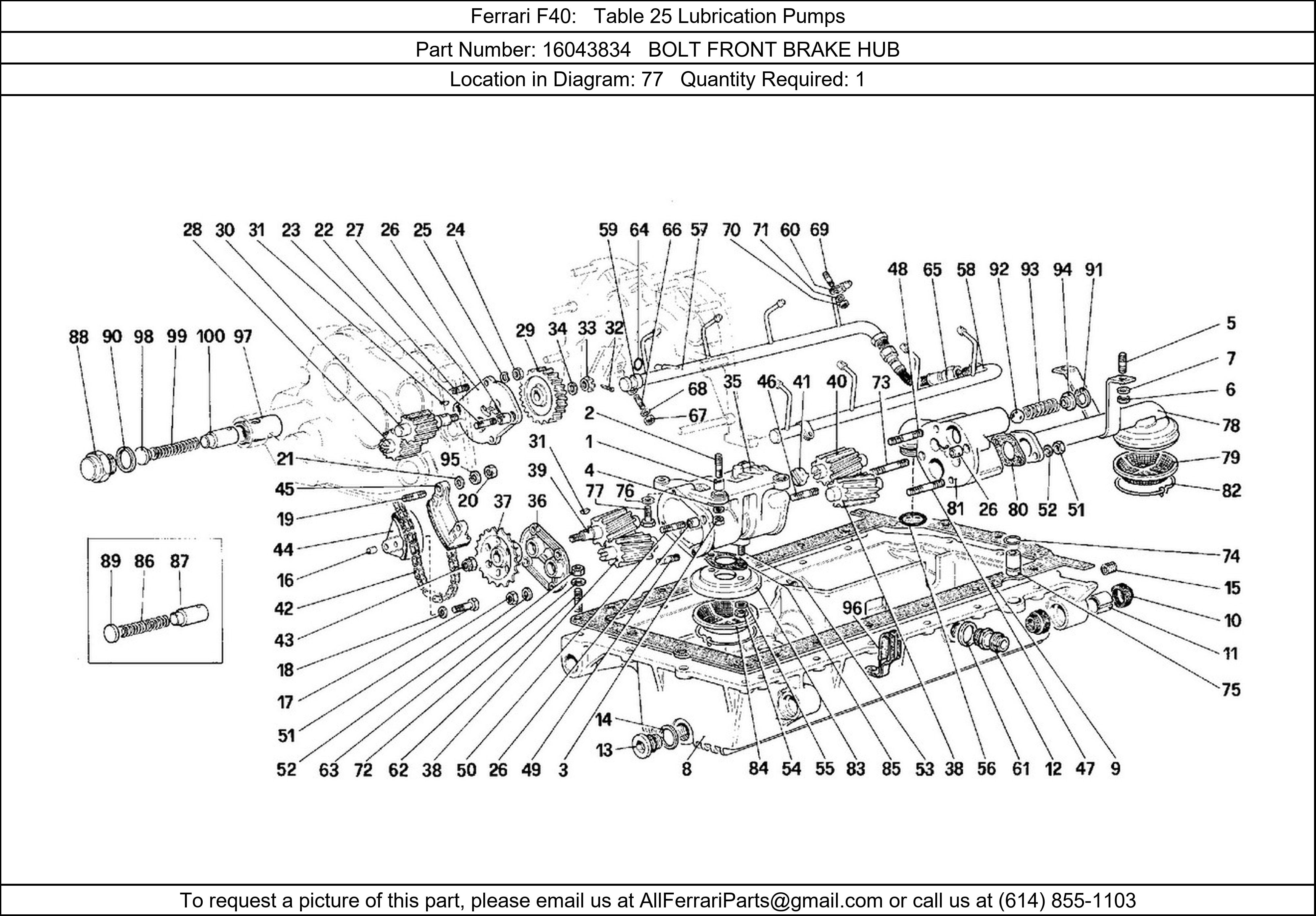 Ferrari Part 16043834, BOLT FRONT BRAKE HUB, shown here as used in Ferrari F40 Table 25 Lubrication Pumps. Other uses of this part are shown below: