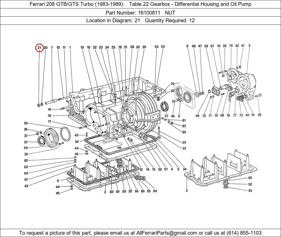 Ferrari Part Number 16100811, NUT shown here as used in Ferrari 208 GTB/GTS Turbo (1983-1989) Table 22 Gearbox - Differential Housing and Oil Pump. Location in Diagram: 21. Required Quantity: 12. This Ferrari part is used in more than one diagram. Click on the diagrams below to see alternative uses of this part: