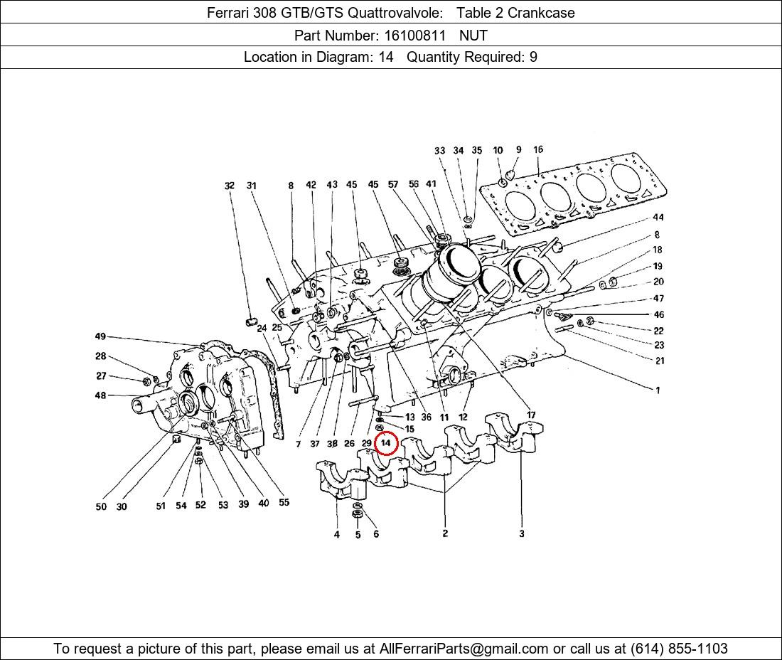 Ferrari Part Number 16100811, NUT shown here as used in Ferrari 308 GTB/GTS Quattrovalvole Table 2 Crankcase. Location in Diagram: 14. Required Quantity: 9. This Ferrari part is used in more than one diagram. Click on the diagrams below to see alternative uses of this part:
