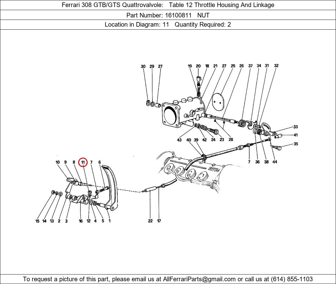 Ferrari Part Number 16100811, NUT shown here as used in Ferrari 308 GTB/GTS Quattrovalvole Table 12 Throttle Housing And Linkage. Location in Diagram: 11. Required Quantity: 2. This Ferrari part is used in more than one diagram. Click on the diagrams below to see alternative uses of this part:
