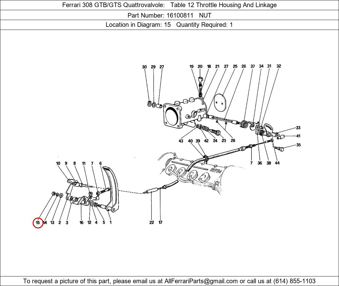 Ferrari Part Number 16100811, NUT shown here as used in Ferrari 308 GTB/GTS Quattrovalvole Table 12 Throttle Housing And Linkage. Location in Diagram: 15. Required Quantity: 1. This Ferrari part is used in more than one diagram. Click on the diagrams below to see alternative uses of this part: