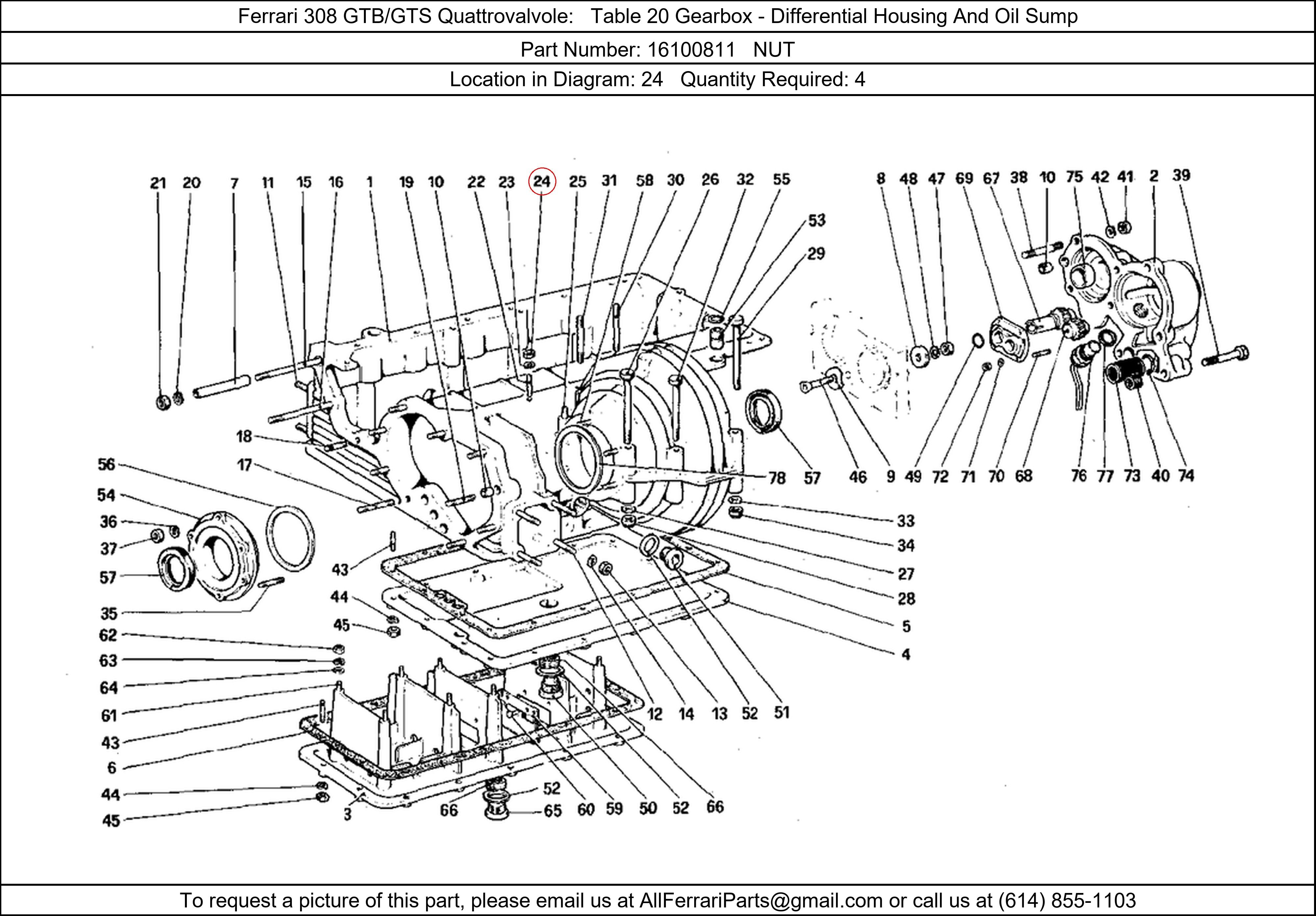 Ferrari Part Number 16100811, NUT shown here as used in Ferrari 308 GTB/GTS Quattrovalvole Table 20 Gearbox - Differential Housing And Oil Sump. Location in Diagram: 24. Required Quantity: 4. This Ferrari part is used in more than one diagram. Click on the diagrams below to see alternative uses of this part: