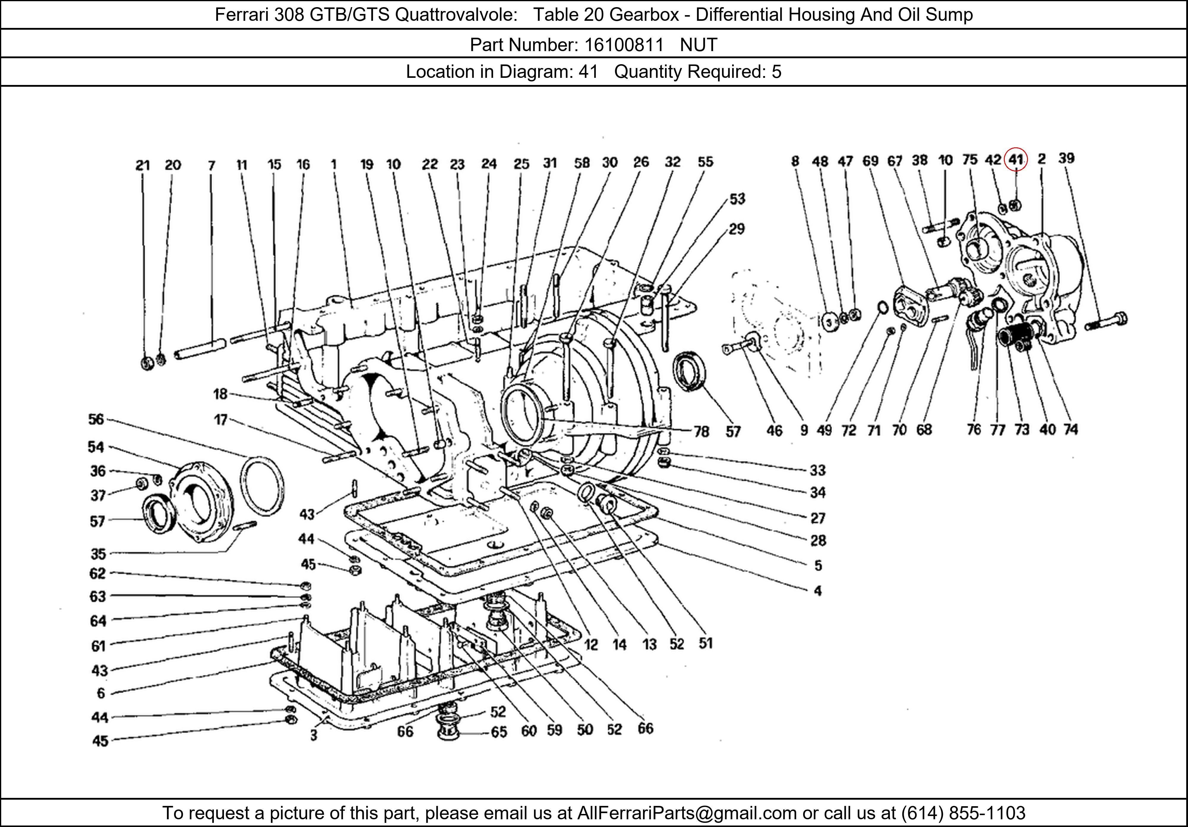 Ferrari Part Number 16100811, NUT shown here as used in Ferrari 308 GTB/GTS Quattrovalvole Table 20 Gearbox - Differential Housing And Oil Sump. Location in Diagram: 41. Required Quantity: 5. This Ferrari part is used in more than one diagram. Click on the diagrams below to see alternative uses of this part: