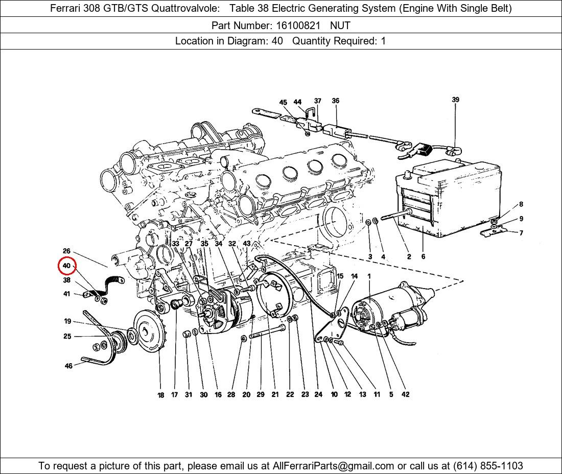 Ferrari Part Number 16100821, NUT shown here as used in Ferrari 308 GTB/GTS Quattrovalvole Table 38 Electric Generating System (Engine With Single Belt). Location in Diagram: 40. Required Quantity: 1. This Ferrari part is used in more than one diagram. Click on the diagrams below to see alternative uses of this part: