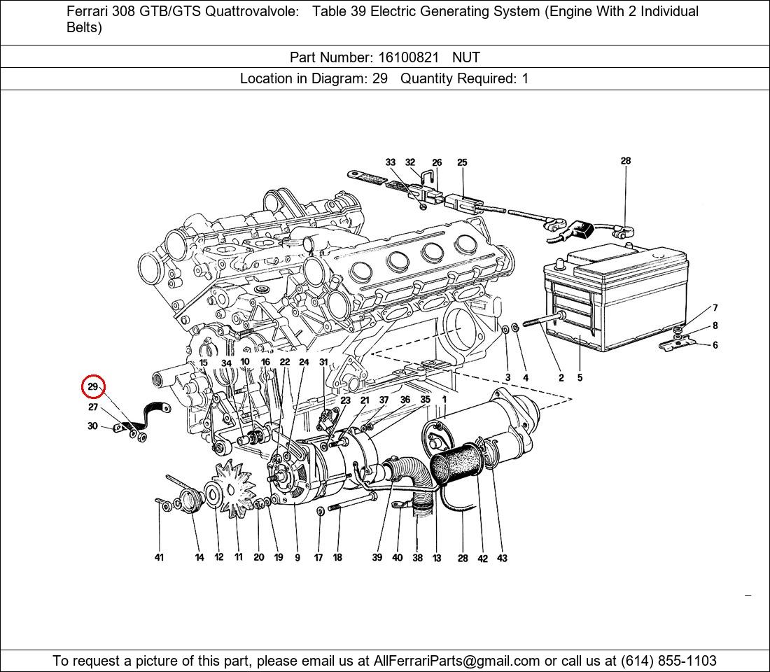 Ferrari Part Number 16100821, NUT shown here as used in Ferrari 308 GTB/GTS Quattrovalvole Table 39 Electric Generating System (Engine With 2 Individual Belts). Location in Diagram: 29. Required Quantity: 1. This Ferrari part is used in more than one diagram. Click on the diagrams below to see alternative uses of this part: