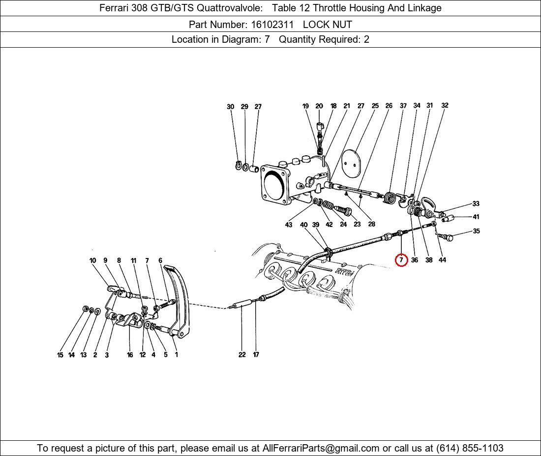 Ferrari Part Number 16102311, LOCK NUT shown here as used in Ferrari 308 GTB/GTS Quattrovalvole Table 12 Throttle Housing And Linkage. Location in Diagram: 7. Required Quantity: 2. This Ferrari part is used in more than one diagram. Click on the diagrams below to see alternative uses of this part: