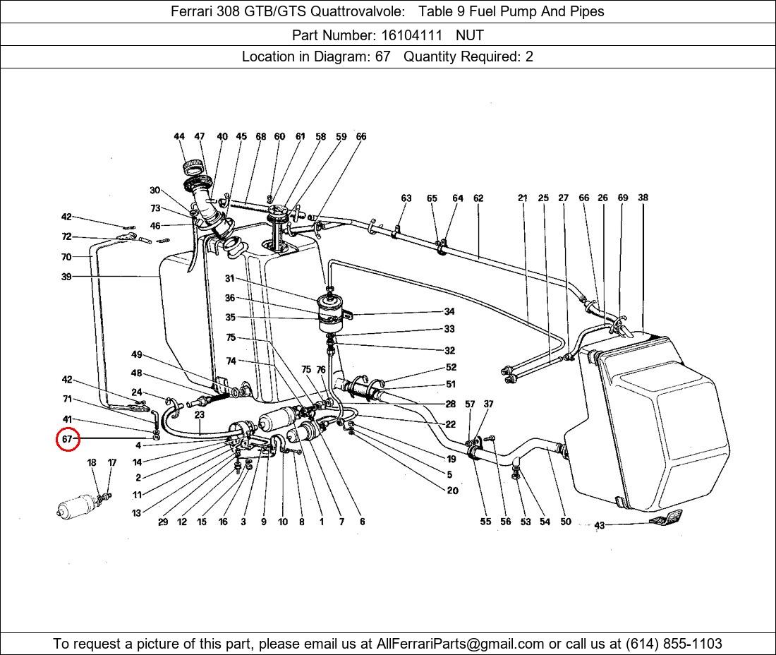 Ferrari Part Number 16104111, NUT shown here as used in Ferrari 308 GTB/GTS Quattrovalvole Table 9 Fuel Pump And Pipes. Location in Diagram: 67. Required Quantity: 2. This Ferrari part is used in more than one diagram. Click on the diagrams below to see alternative uses of this part: