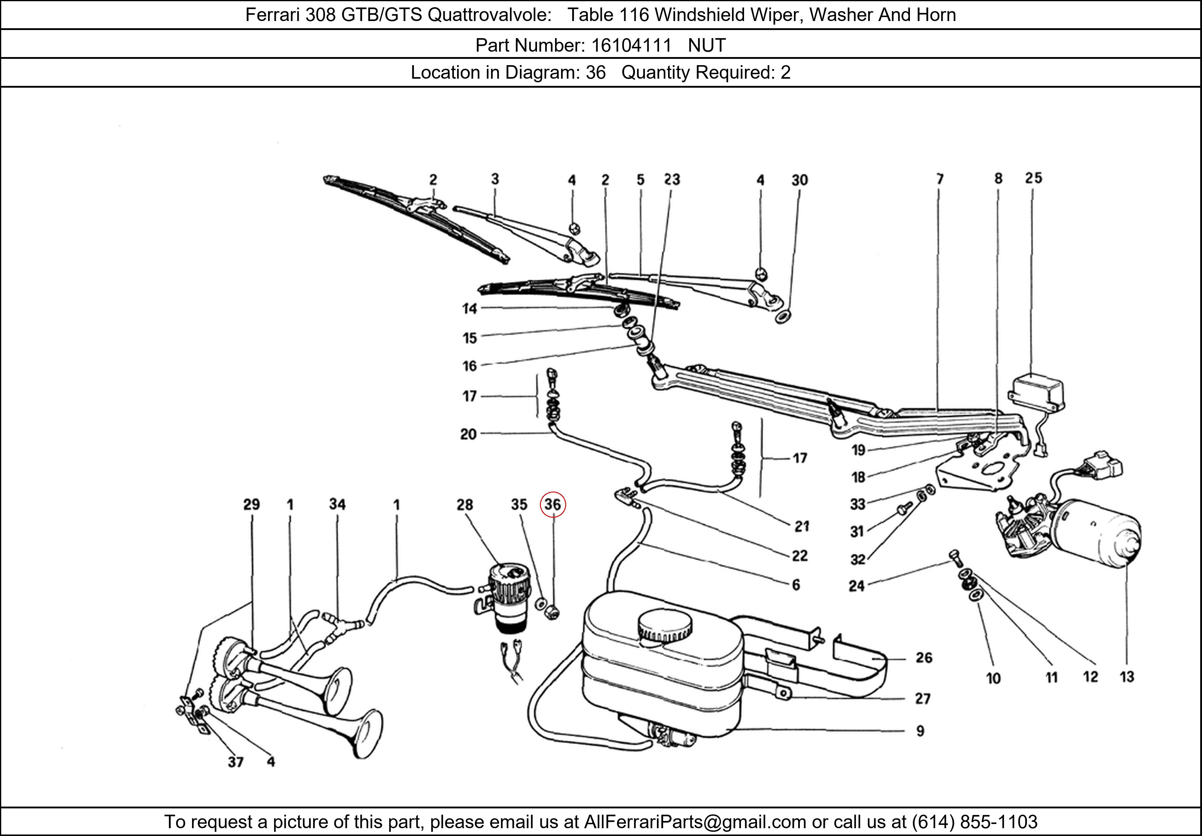 Ferrari Part Number 16104111, NUT shown here as used in Ferrari 308 GTB/GTS Quattrovalvole Table 116 Windshield Wiper, Washer And Horn. Location in Diagram: 36. Required Quantity: 2. This Ferrari part is used in more than one diagram. Click on the diagrams below to see alternative uses of this part: