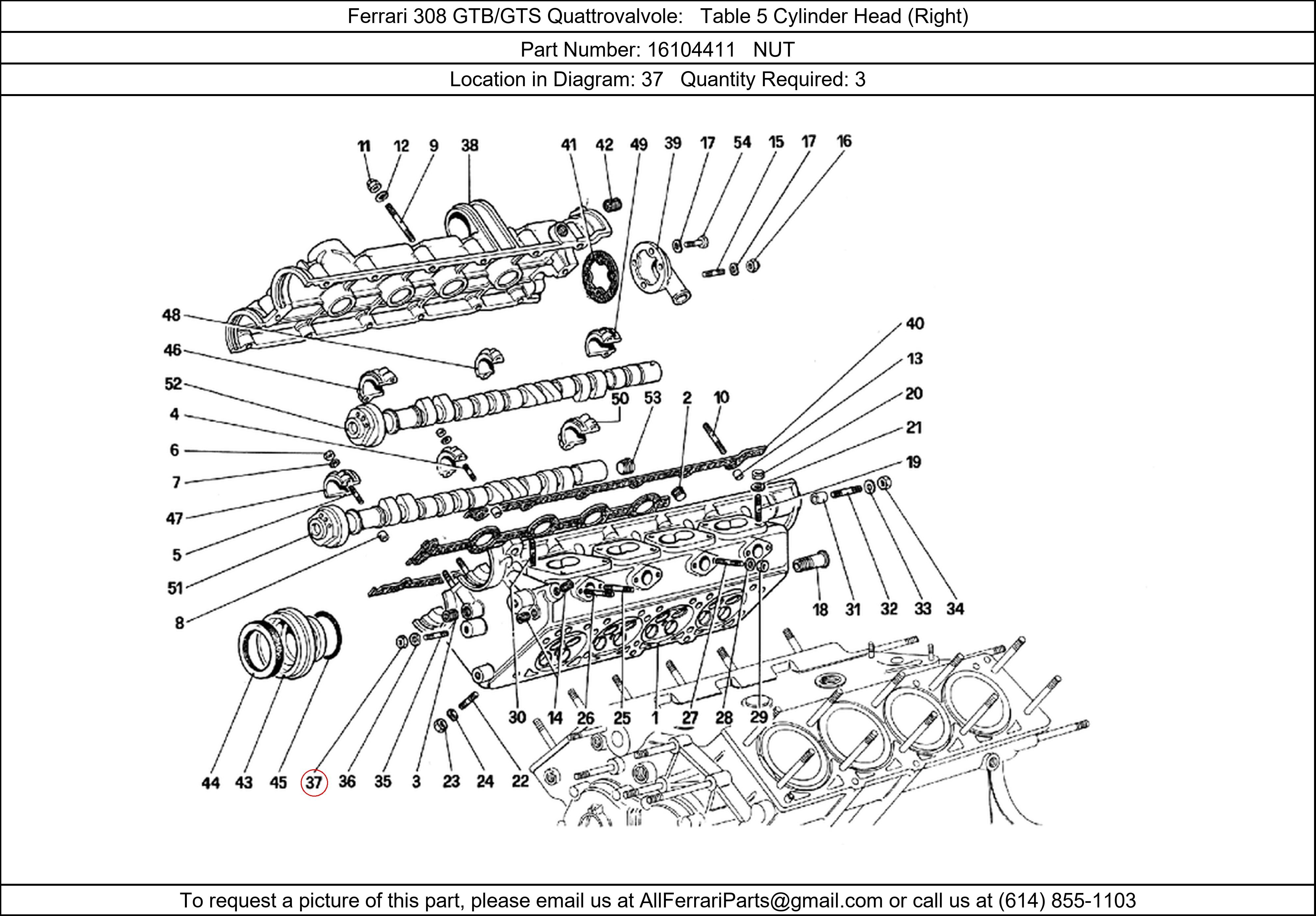 Ferrari Part Number 16104411, NUT shown here as used in Ferrari 308 GTB/GTS Quattrovalvole Table 5 Cylinder Head (Right). Location in Diagram: 37. Required Quantity: 3. This Ferrari part is used in more than one diagram. Click on the diagrams below to see alternative uses of this part: