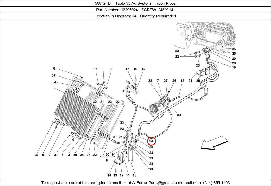 Ferrari Part Number 16296924, SCREW -M6 X 14- shown here as used in 599 GTB Table 55 Ac System - Freon Pipes. Location in Diagram: 24. Required Quantity: 1. This Ferrari part is used in more than one diagram. Click on the diagrams below to see alternative uses of this part:
