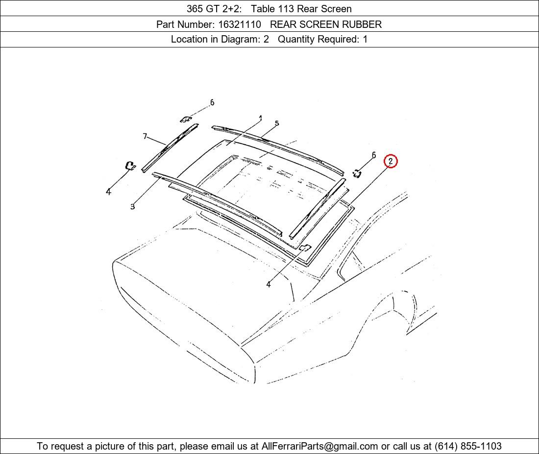Ferrari Part Number 16321110, REAR SCREEN RUBBER shown here as used in 365 GT 2+2 Table 113 Rear Screen. Location in Diagram: 2. Required Quantity: 1
