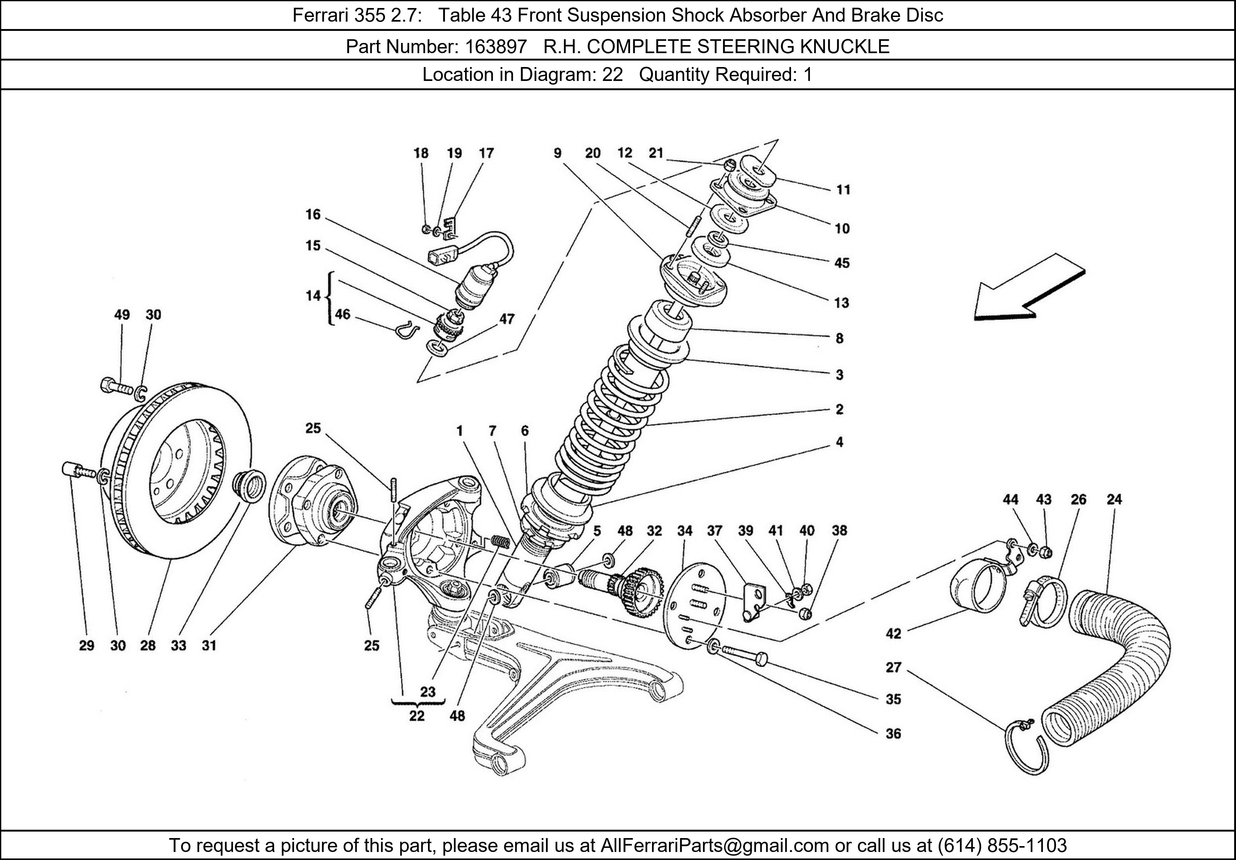 Ferrari Part 163897, R.H. COMPLETE STEERING KNUCKLE, shown here as used in Ferrari 355 2.7 Table 43 Front Suspension Shock Absorber And Brake Disc.