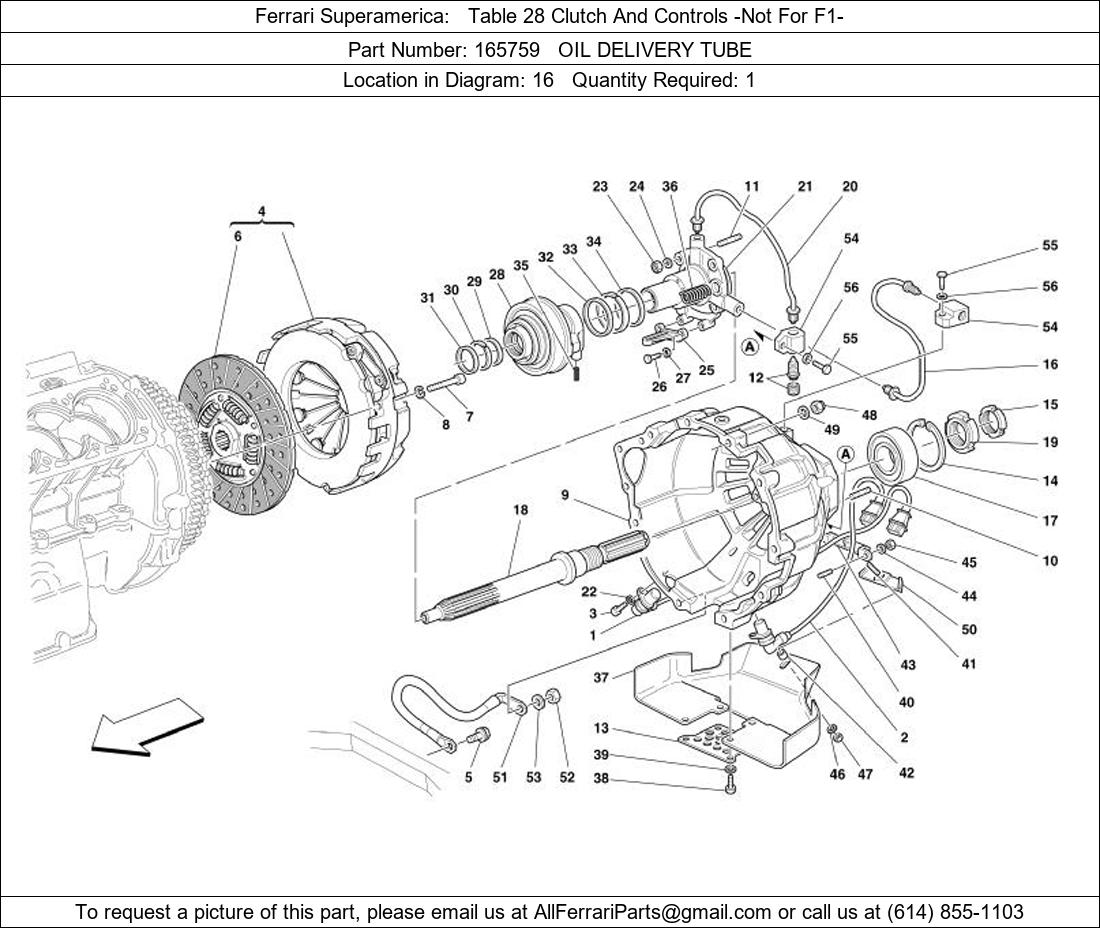 Ferrari Part 165759, OIL DELIVERY TUBE, shown here as used in Ferrari Superamerica Table 28 Clutch And Controls -Not For F1-. Other uses of this part are shown below: