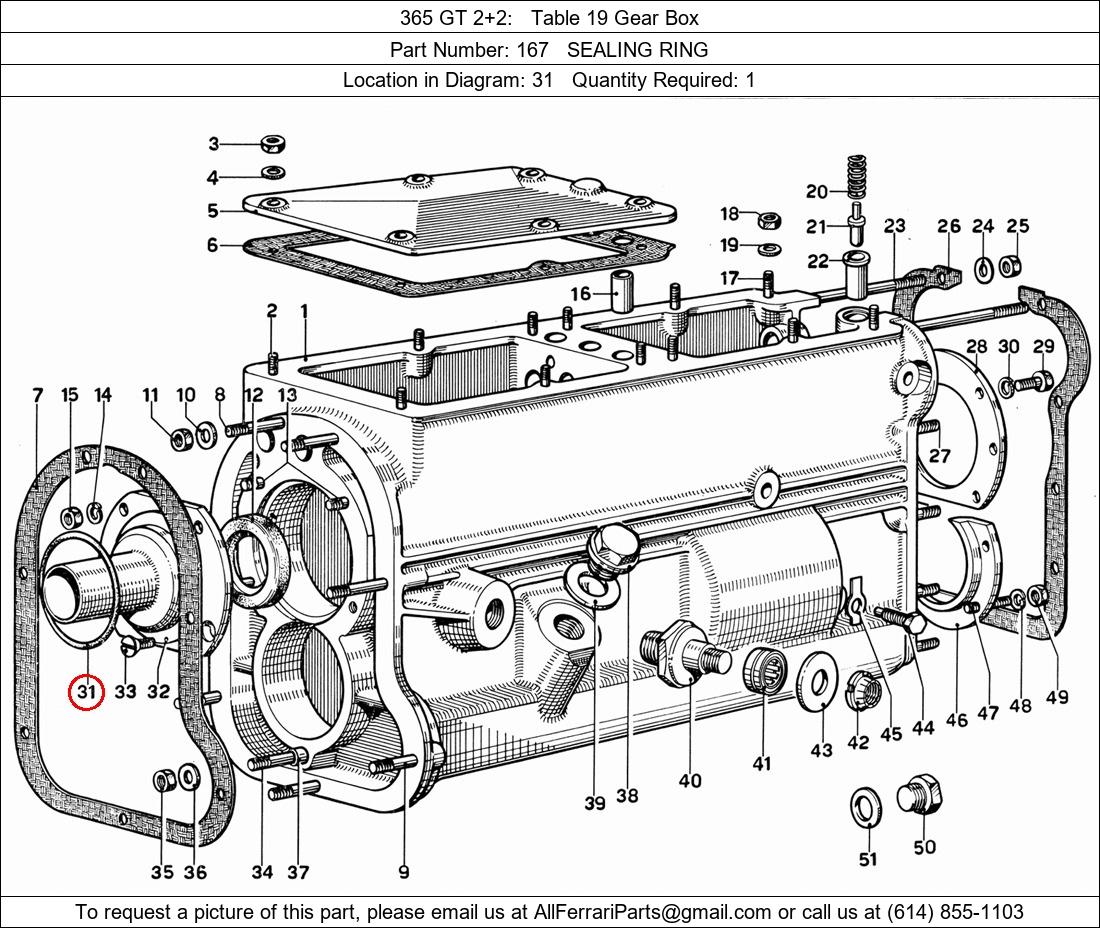 Ferrari Part Number 167, SEALING RING shown here as used in 365 GT 2+2 Table 19 Gear Box. Location in Diagram: 31. Required Quantity: 1
