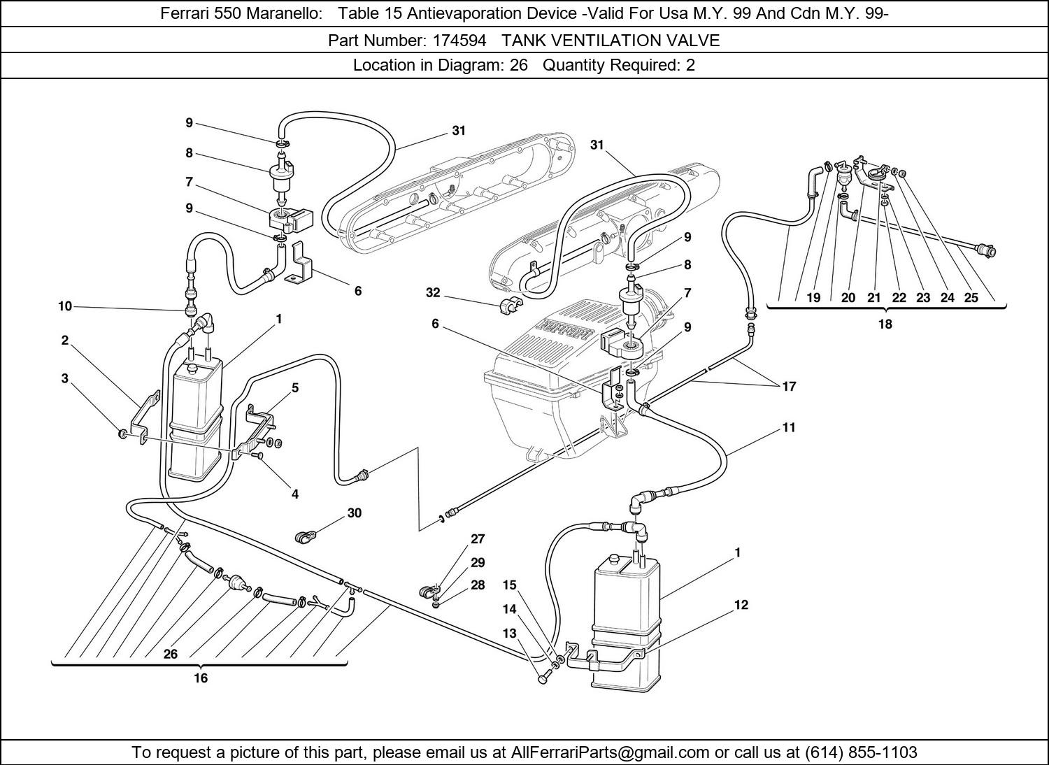 Ferrari Part 174594, TANK VENTILATION VALVE, shown here as used in Ferrari 550 Maranello Table 15 Antievaporation Device -Valid For Usa M.Y. 99 And Cdn M.Y. 99-. Other uses of this part are shown below: