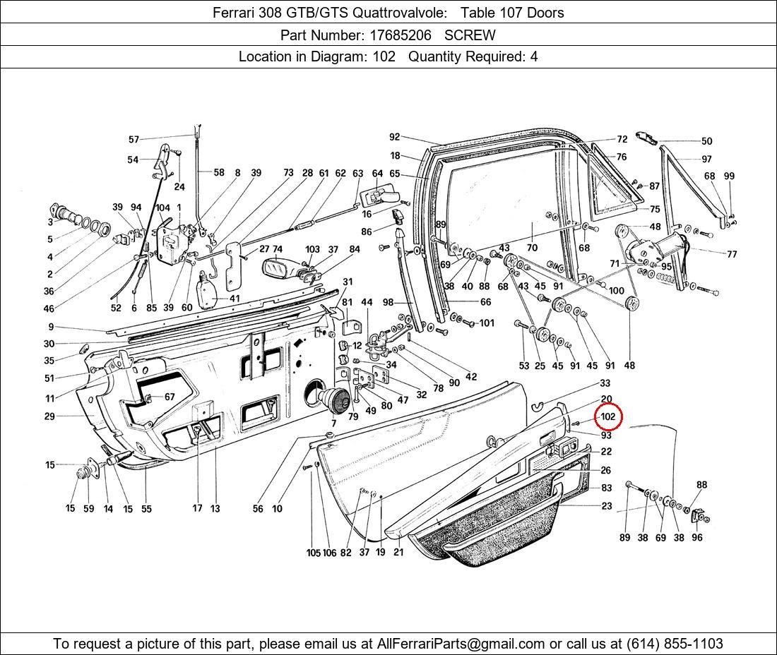 Ferrari Part Number 17685206, SCREW shown here as used in Ferrari 308 GTB/GTS Quattrovalvole Table 107 Doors. Location in Diagram: 102. Required Quantity: 4. This Ferrari part is used in more than one diagram. Click on the diagrams below to see alternative uses of this part: