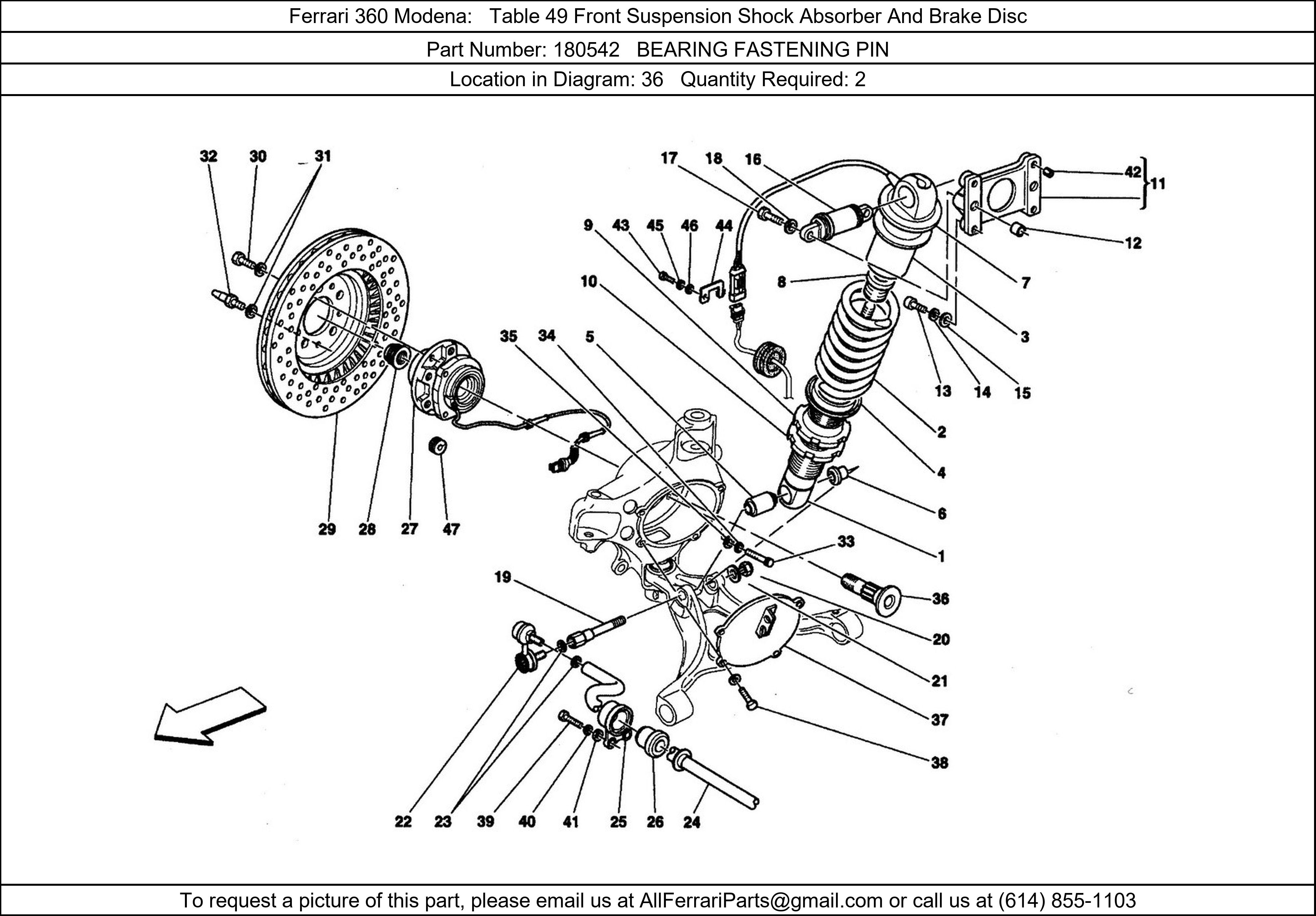 Ferrari Part 180542, BEARING FASTENING PIN, shown here as used in Ferrari 360 Modena Table 49 Front Suspension Shock Absorber And Brake Disc. Other uses of this part are shown below: