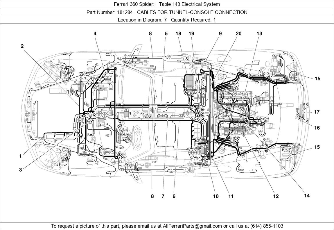 Ferrari Part 181284, CABLES FOR TUNNEL-CONSOLE CONNECTION, shown here as used in Ferrari 360 Spider Table 143 Electrical System.