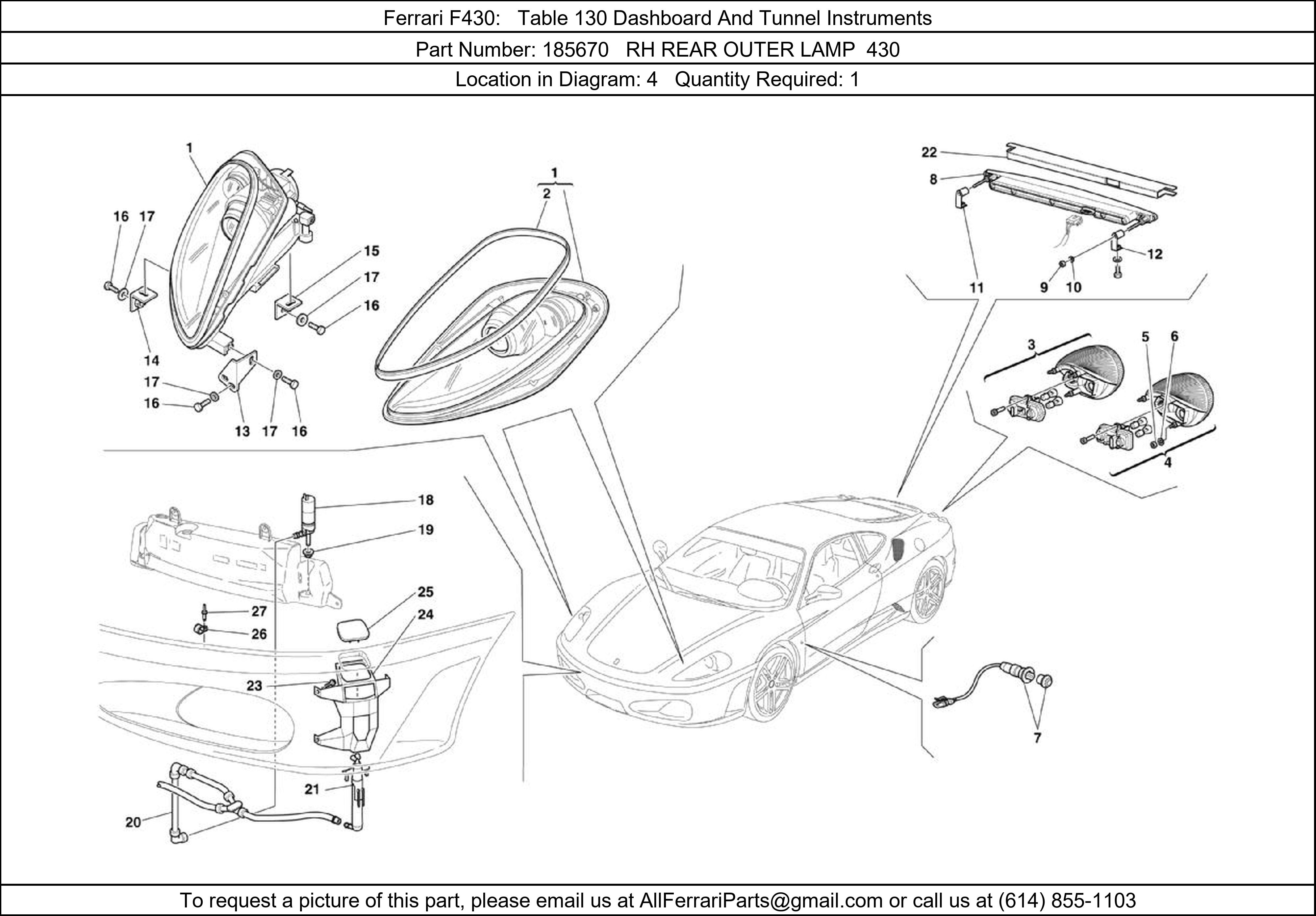 Ferrari Part 185670, RH REAR OUTER LAMP 430, shown here as used in Ferrari F430 Table 130 Dashboard And Tunnel Instruments. Other uses of this part are shown below: