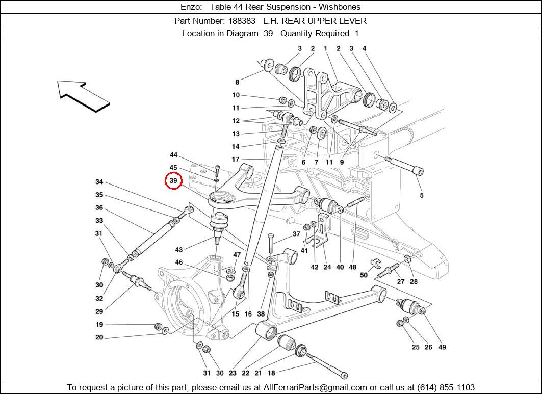 Ferrari Part Number 188383, L.H. REAR UPPER LEVER shown here as used in Enzo Table 44 Rear Suspension - Wishbones. Location in Diagram: 39. Required Quantity: 1