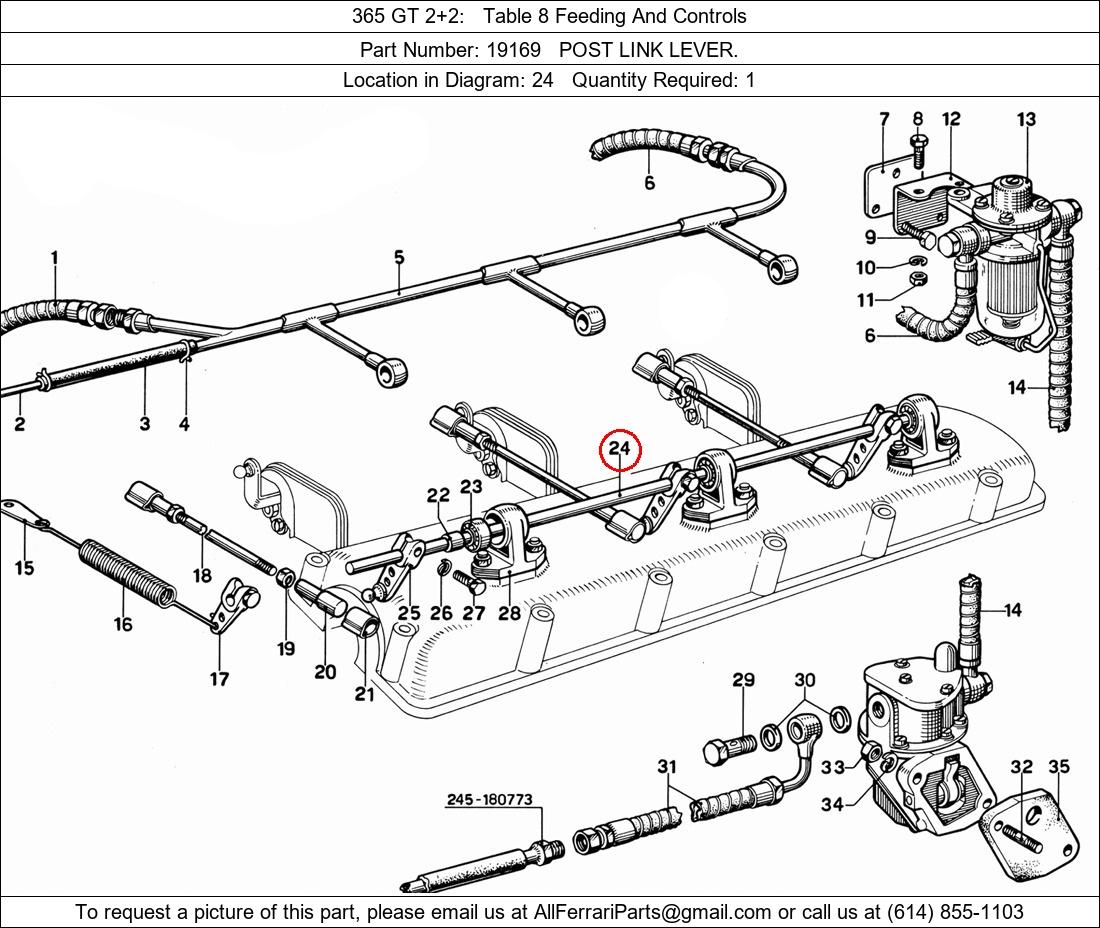 Ferrari Part Number 19169, POST LINK LEVER. shown here as used in 365 GT 2+2 Table 8 Feeding And Controls. Location in Diagram: 24. Required Quantity: 1. This Ferrari part is used in more than one diagram. Click on the diagrams below to see alternative uses of this part: