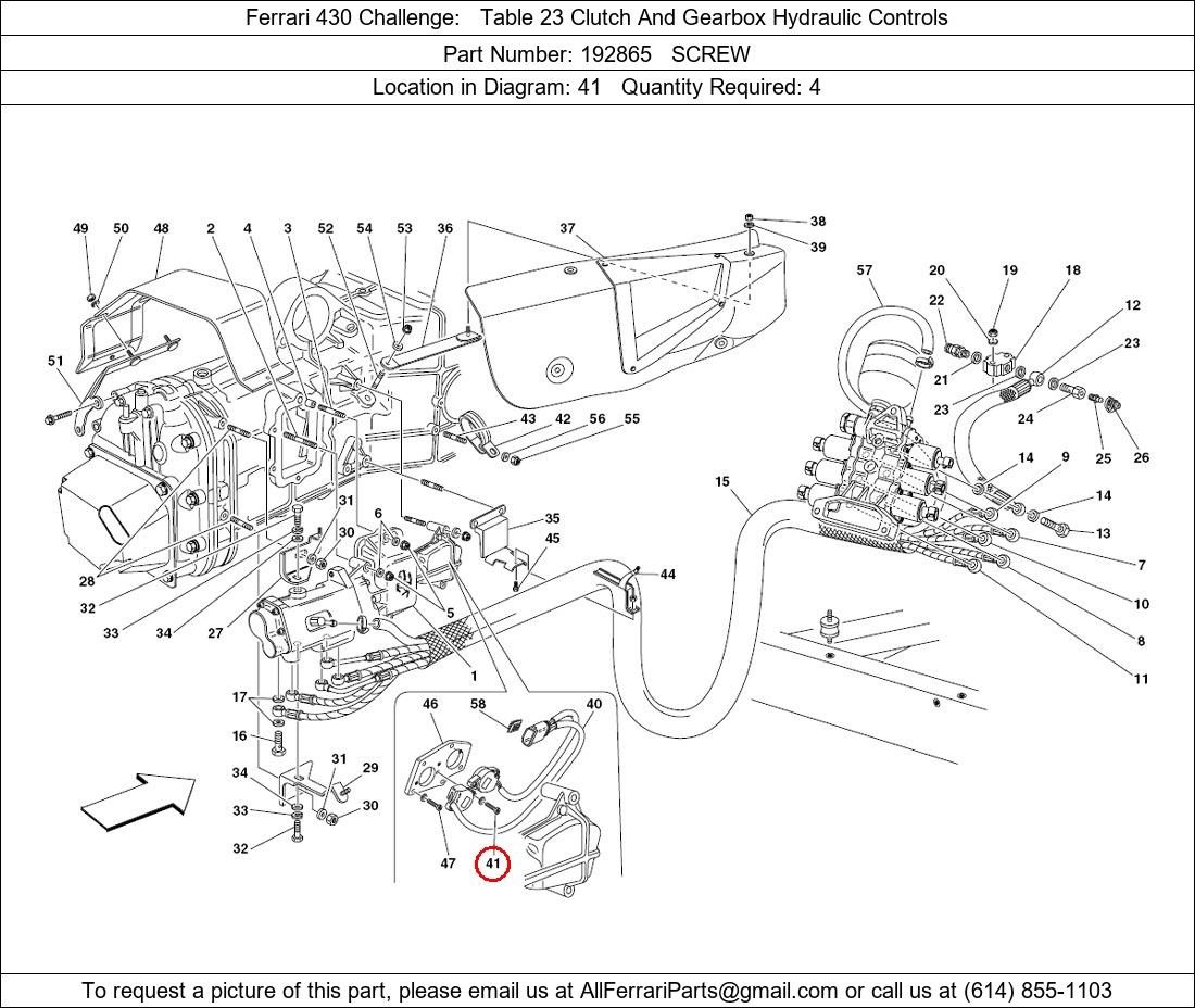 Ferrari Part Number 192865, SCREW shown here as used in Ferrari 430 Challenge Table 23 Clutch And Gearbox Hydraulic Controls. Location in Diagram: 41. Required Quantity: 4. This Ferrari part is used in more than one diagram. Click on the diagrams below to see alternative uses of this part: