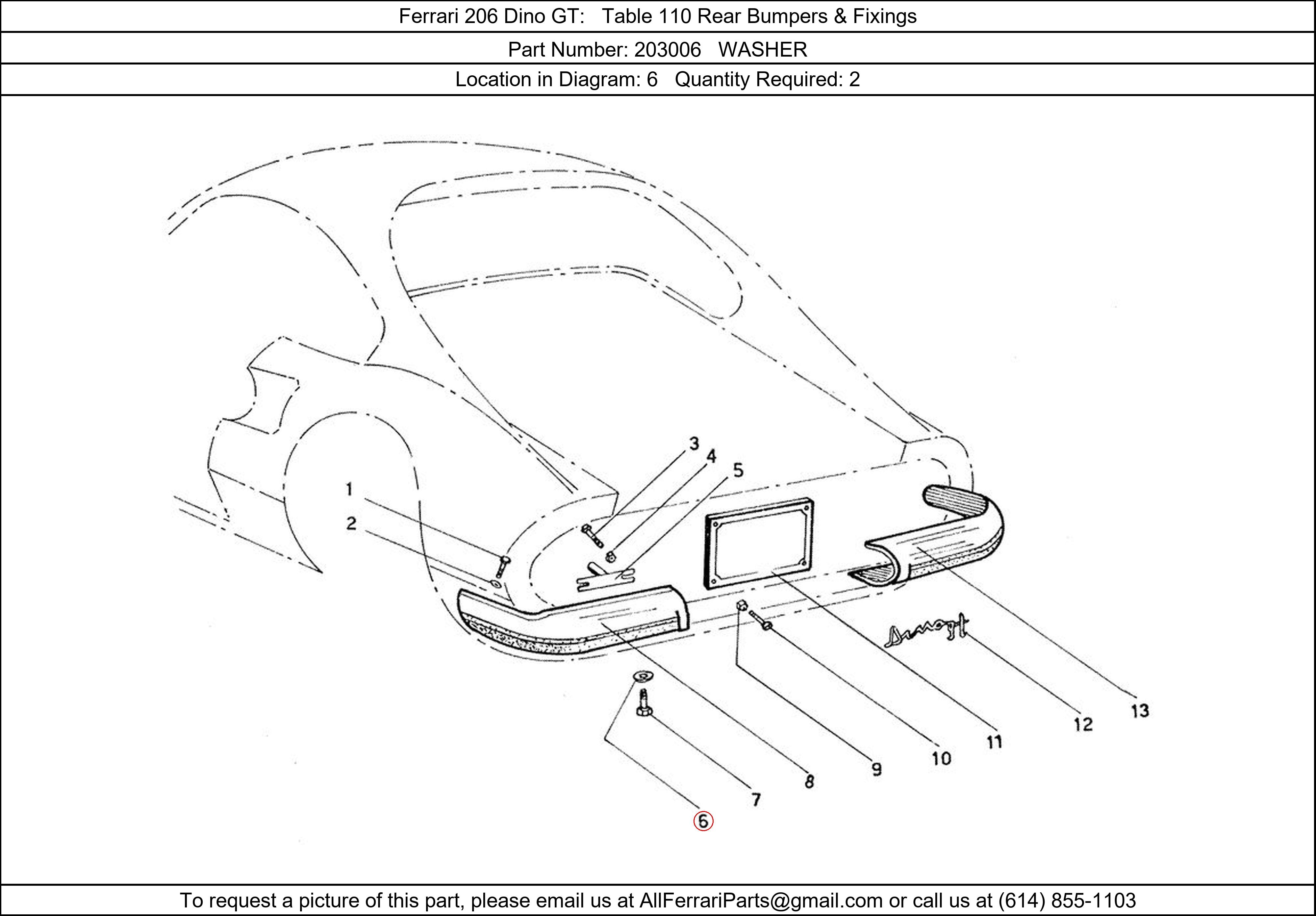 Ferrari Part Number 203006, WASHER shown here as used in Ferrari 206 Dino GT Table 110 Rear Bumpers & Fixings. Location in Diagram: 6. Required Quantity: 2